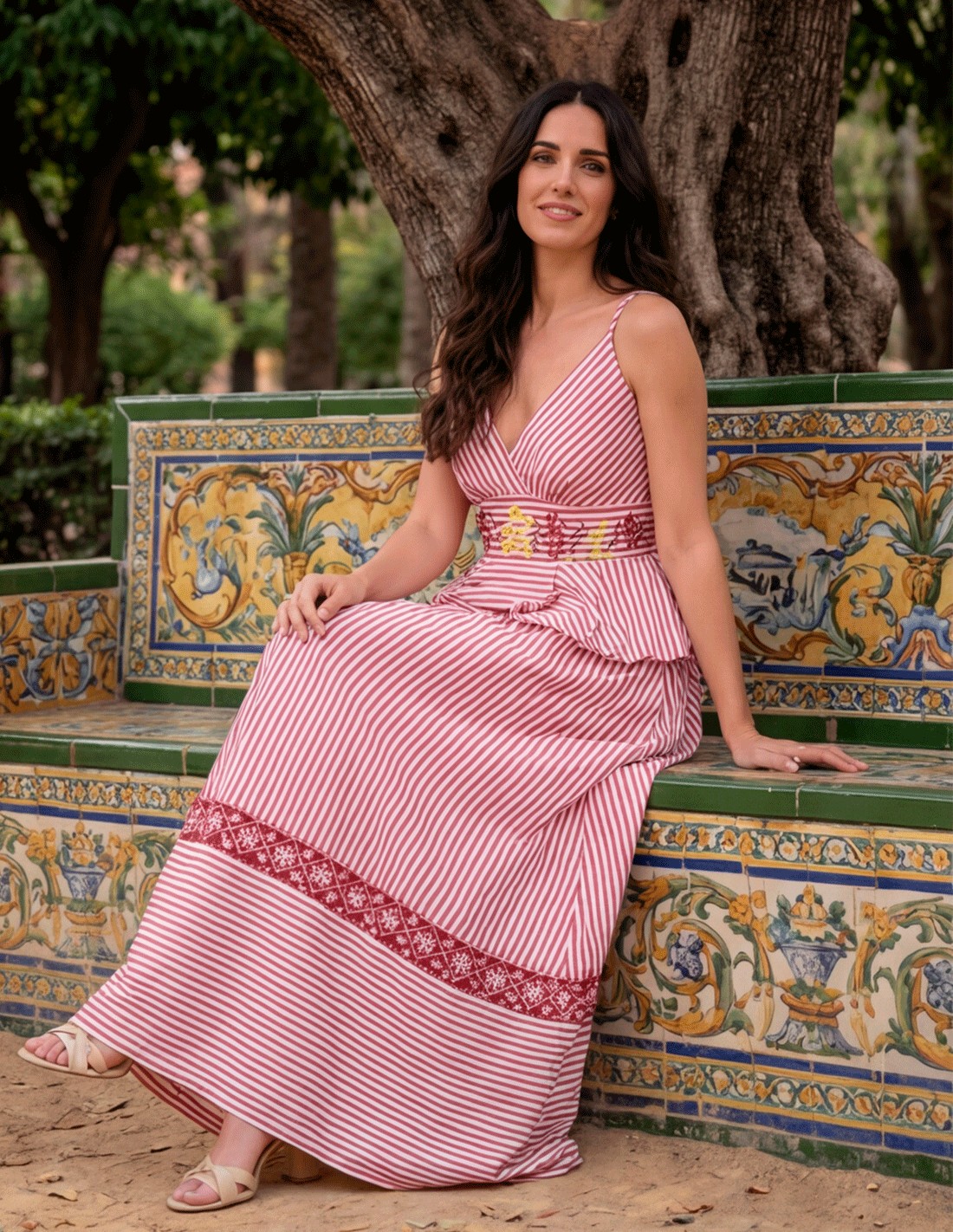 This guest outfit with red stripes and embroidered details is a fresh, original and very flattering option for daytime weddings and summer events.