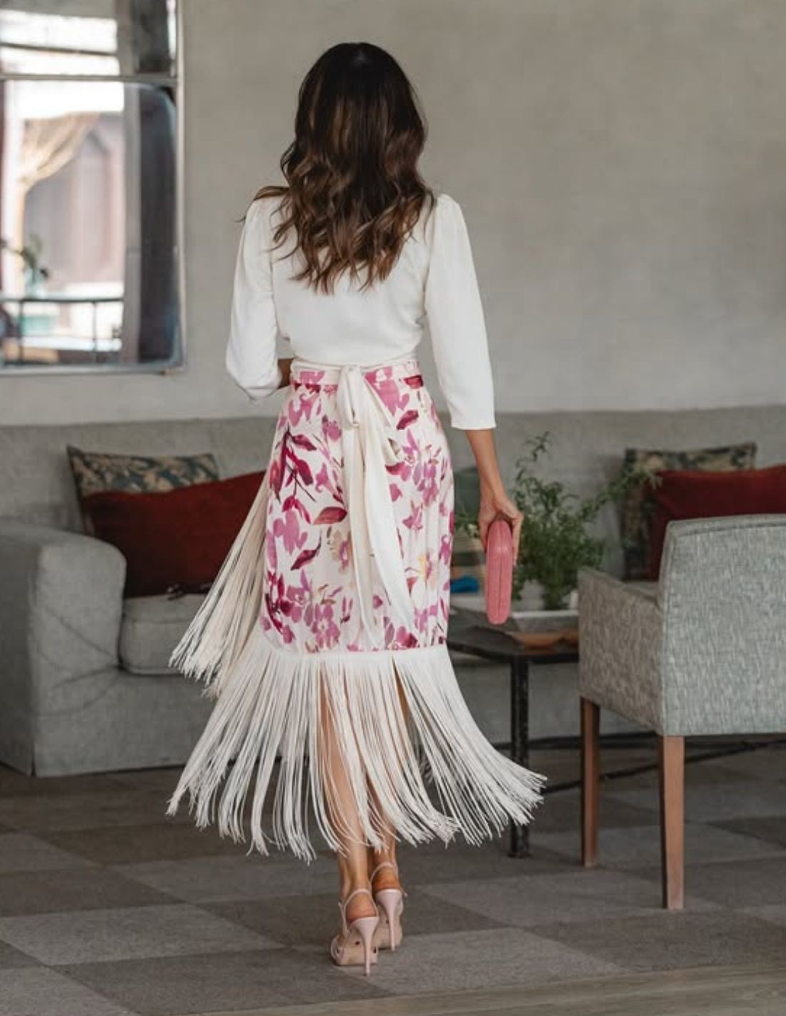This printed blouse and skirt set with draped front and bangs is the perfect choice for guests looking for an original, flattering look with character. The draped front stylizes the silhouette and provides a very elegant wraparound effect, while the bangs add movement and a sophisticated touch that does not go unnoticed.