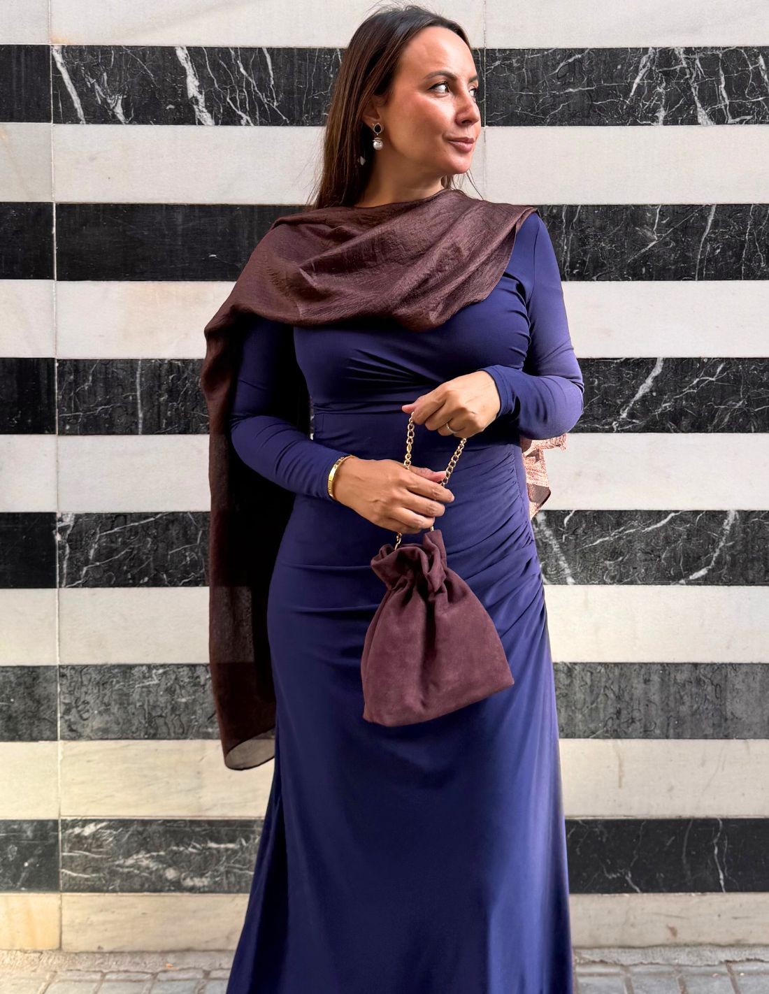 Complete your guest look with this elegant chocolate brown scarf, a versatile and sophisticated accessory that adds style to any look. Its light and soft fabric makes it the perfect choice to accompany you to weddings, events or celebrations both day and night. The chocolate brown color adds elegance, combining perfectly with neutral, golden or powdered tones. Thanks to its timeless design, you can wear it over the shoulders, knotted or as a complement to enhance dresses and guest outfits.