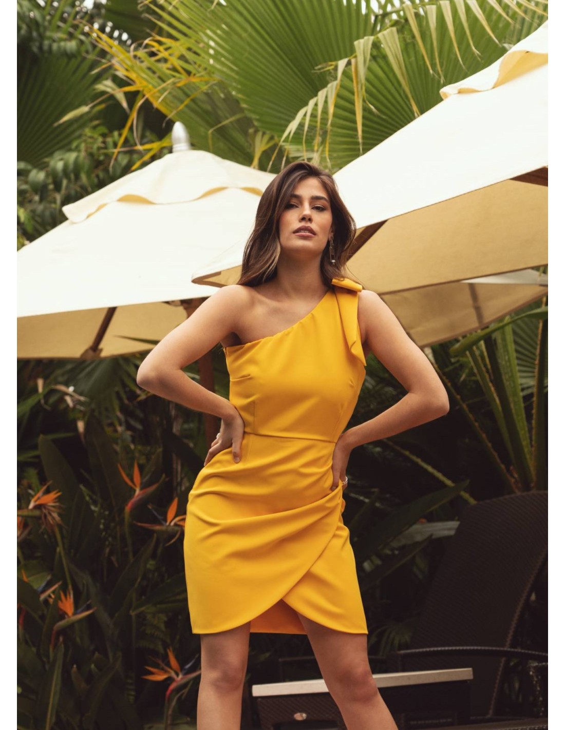 If you have a summer event coming up, this short yellow dress can be your best ally. A short dress in yellow tone, with asymmetrical neckline, with bow detail on the left shoulder and draped effect skirt. Fully lined dress with an invisible zipper on the side of the dress. Perfect for special occasions as well as for a summer day.