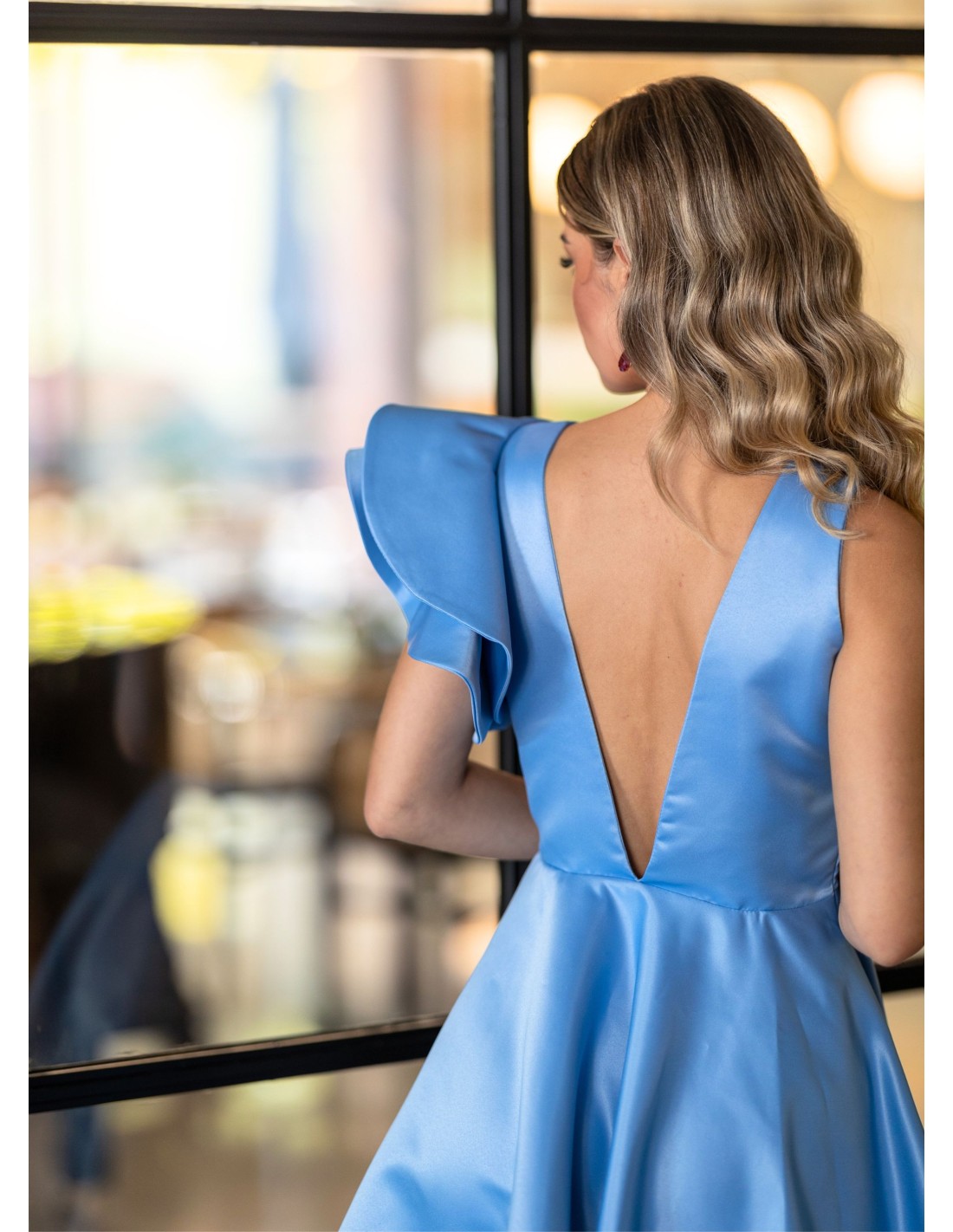 Shine at your next event with this short guest dress. A blue dress in structured fabric, top front with round neckline and V-neckline in the back, fully lined, with ruffles with volume on the left sleeve and accentuated cut in the waist area. Ideal for a spring or summer event.