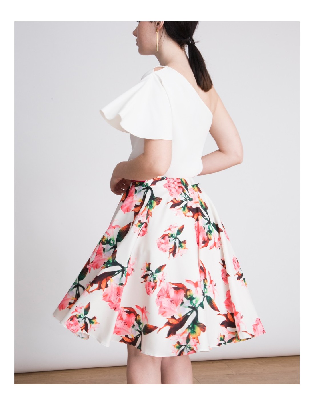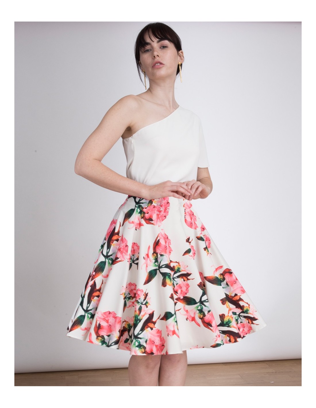 The above-the-knee floral party skirt, The Louisa skirt with flower print is designed by Lauren Lynn London.