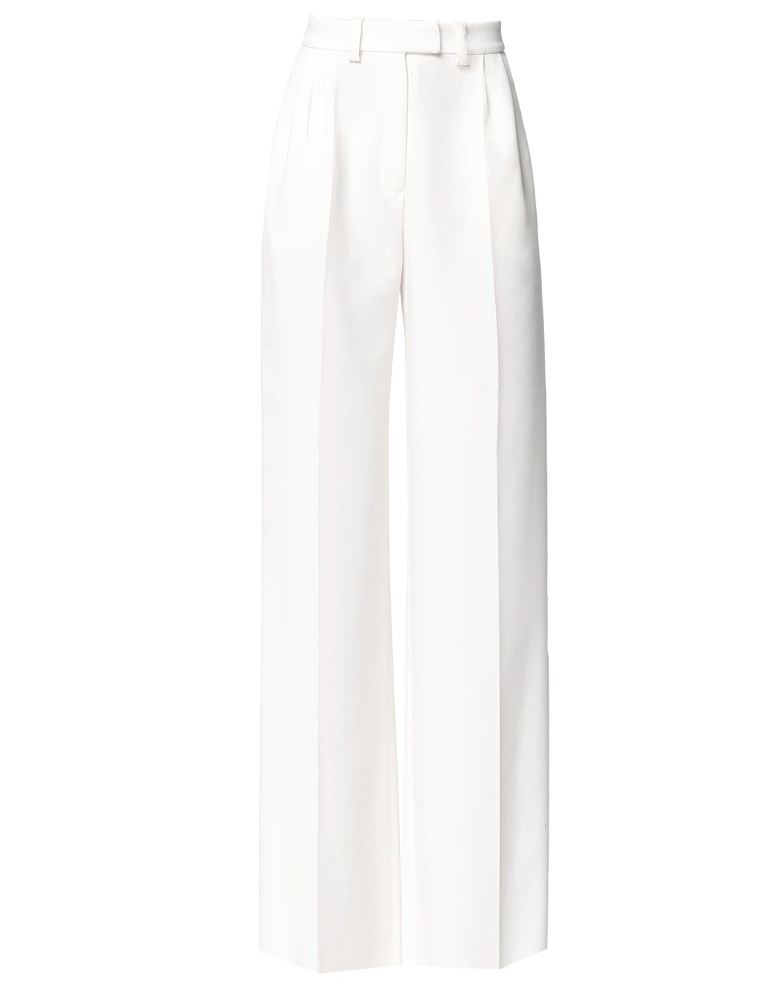 These high-waisted white palazzo suit trousers are designed to look stylish and sophisticated.