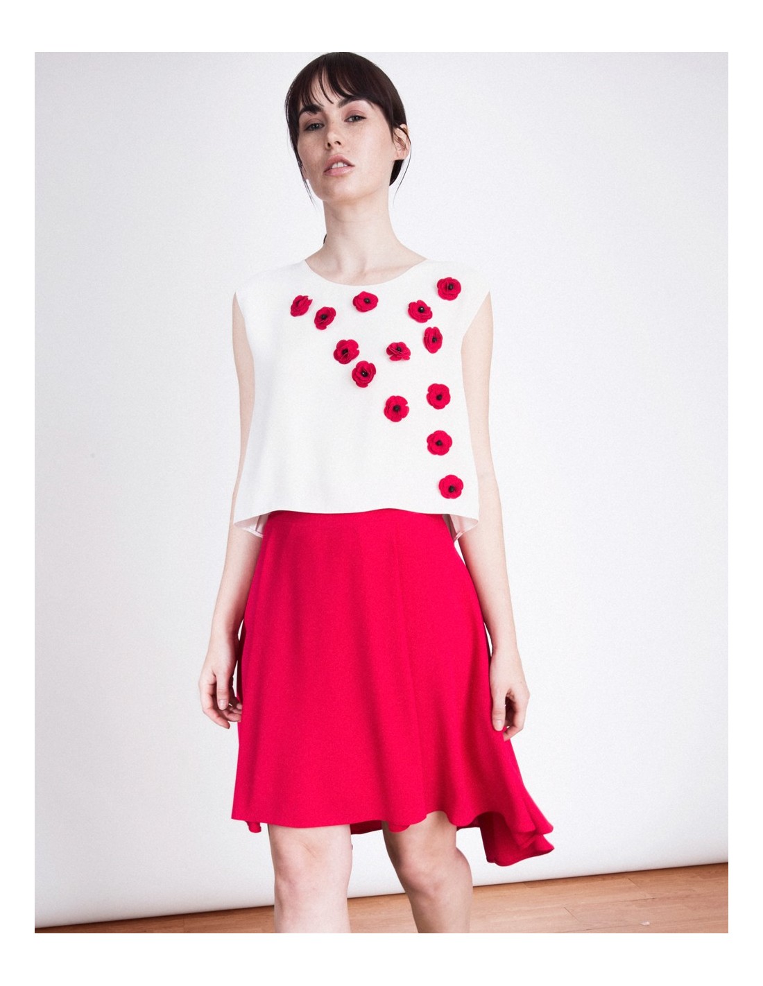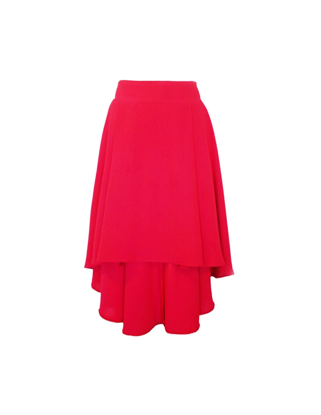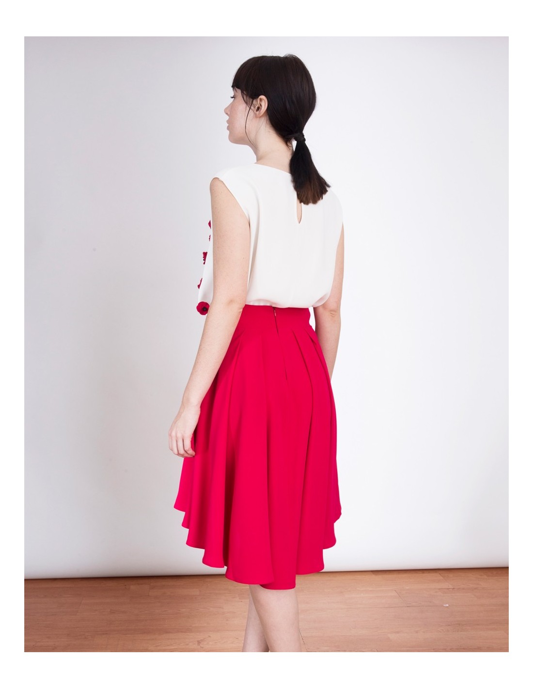 Asymmetrical skirt made of crepe, the asymmetrical detail is placed at the back. This skirt is perfect to be the perfect guest at weddings, baptisms, and communions.
