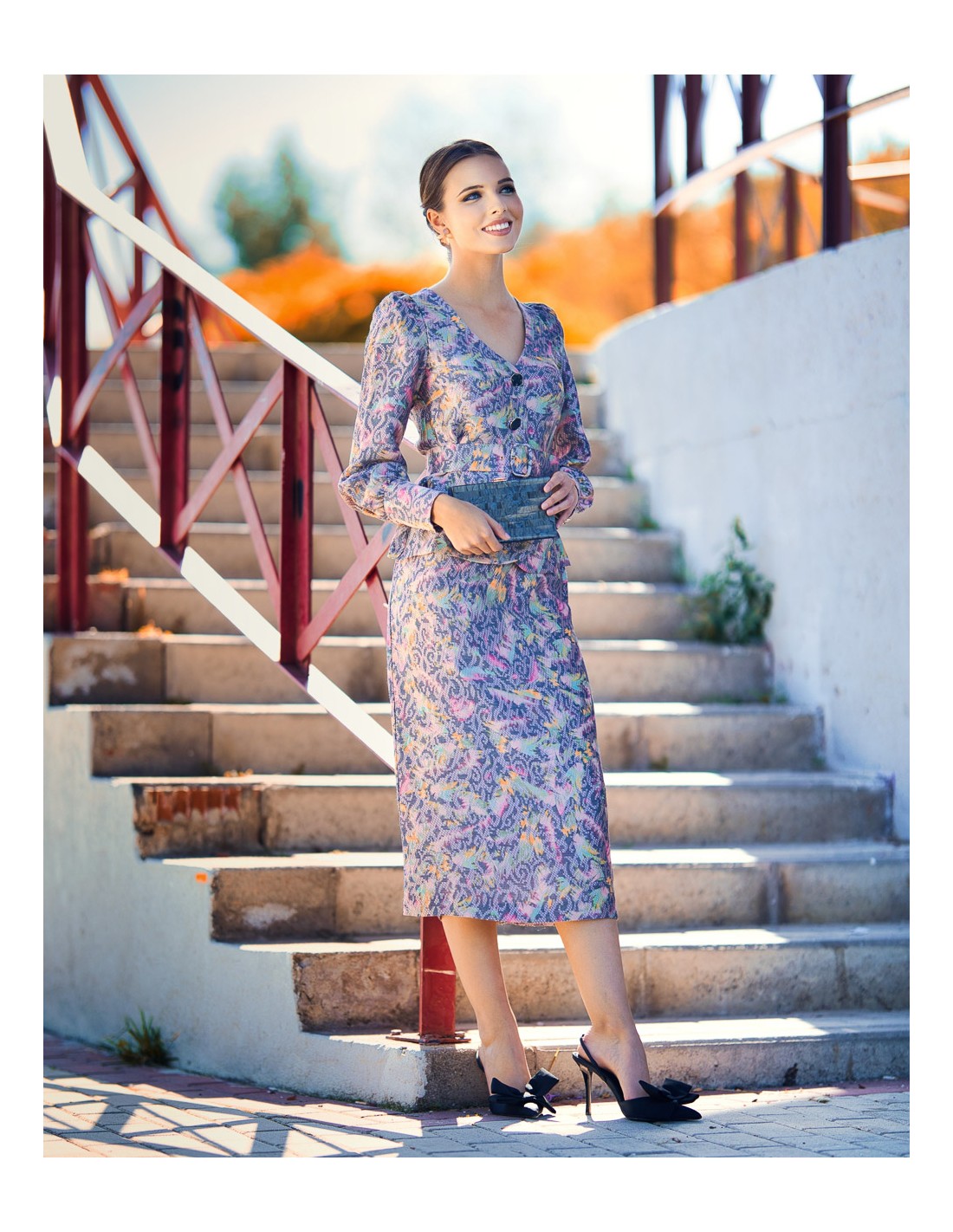Pencil skirt with midi cut and printed in pink and gray perfect for special events and casual looks. Made of a beautiful high quality fabric with a subtle lurex thread in light pink. If you combine it with its blouse of the same fabric, you will have a super versatile and very elegant outfit, which you can use in different special occasions. Use it also separately and you will have hundreds of looks.