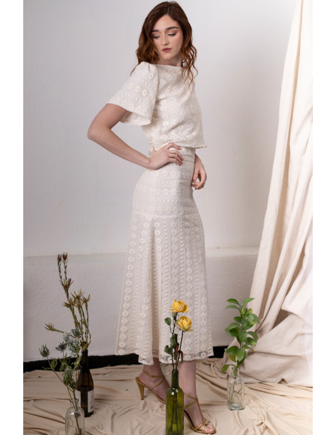 - Ivory macramé midi skirt.