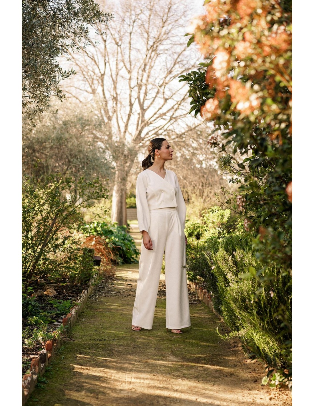 Wide ecru long pants for pre-wedding and civil brides