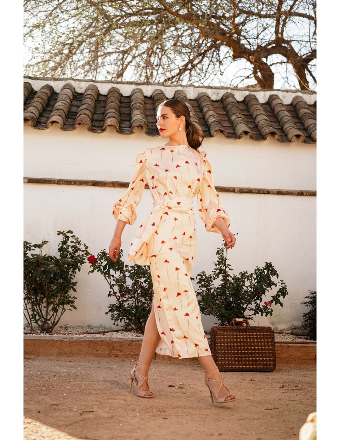 Straight midi skirt with slit and rose print