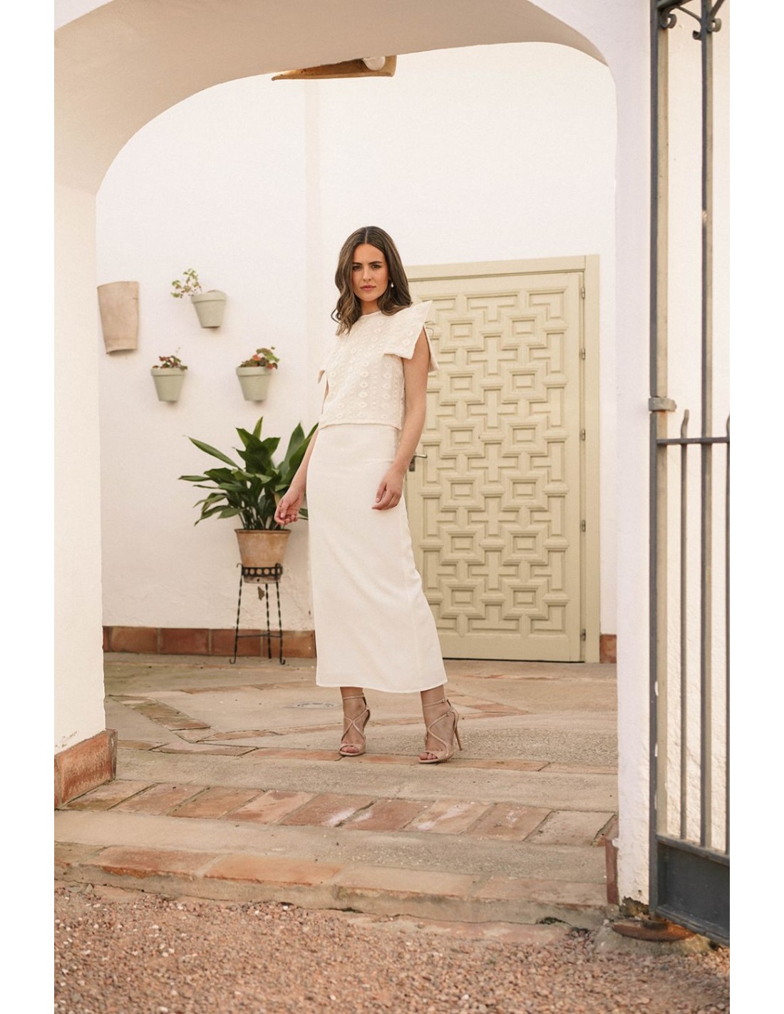 Add a touch of sophistication to your closet with this straight midi skirt in white. Crafted in a soft, lightweight fabric, its clean-cut, mid-calf length design slims the figure and easily adapts to any occasion. Ideal for pairing with basic blouses or T-shirts for a casual look.