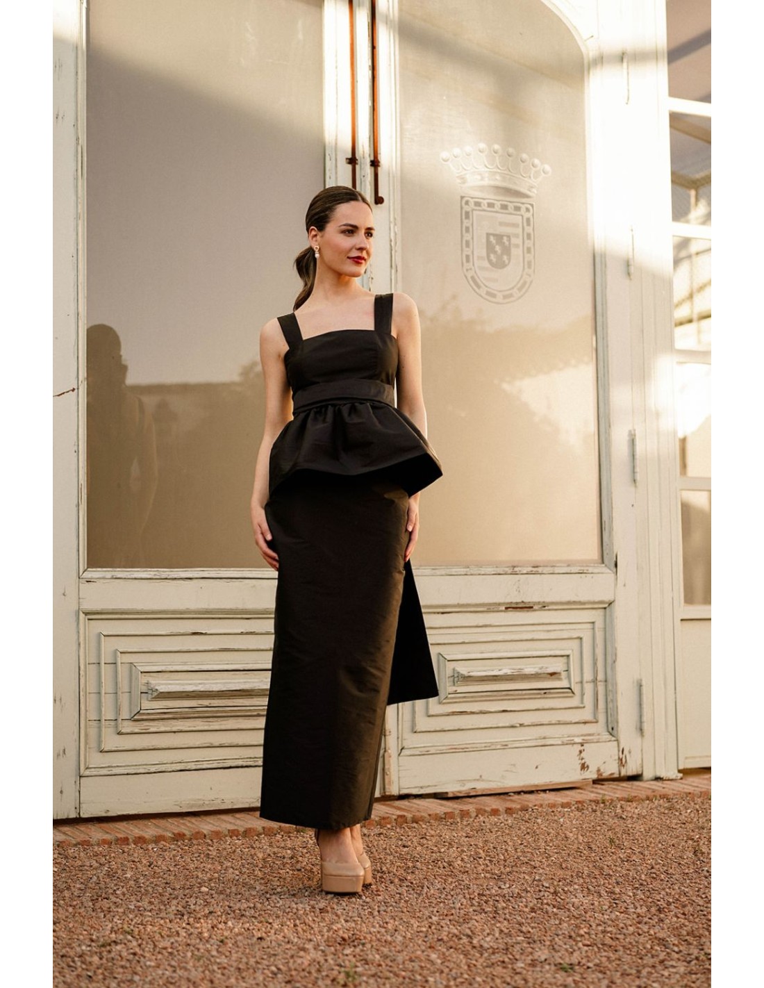 Discover the timeless style of this straight midi skirt in black taffeta, a versatile and elegant garment perfect for your most special events. Its straight design enhances the silhouette, while the back slit adds comfort and a touch of sophistication.