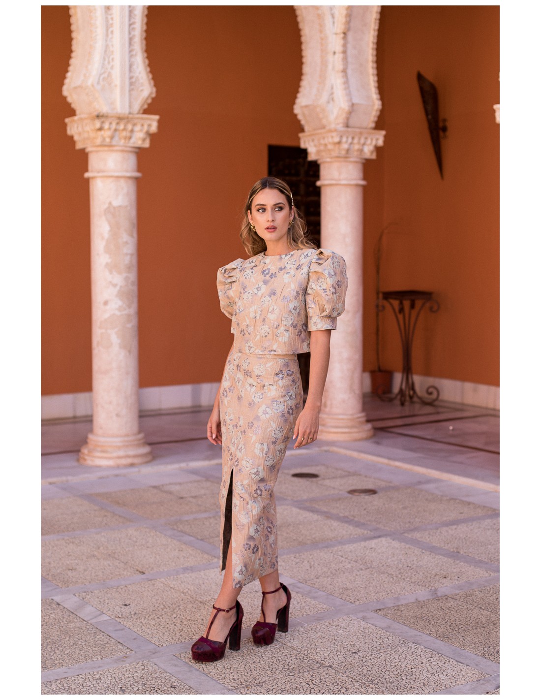 The infinite opening in the front gives a sensual, feminine and very modern air, ideal to wear in movement. Designed to stand out in special events, this skirt becomes the protagonist when combined with the matching top, achieving a harmonious and spectacular set. Perfect for guests who want to set the trend with their own style.