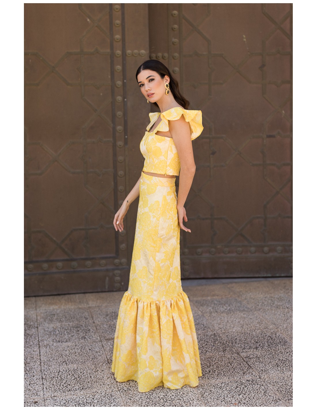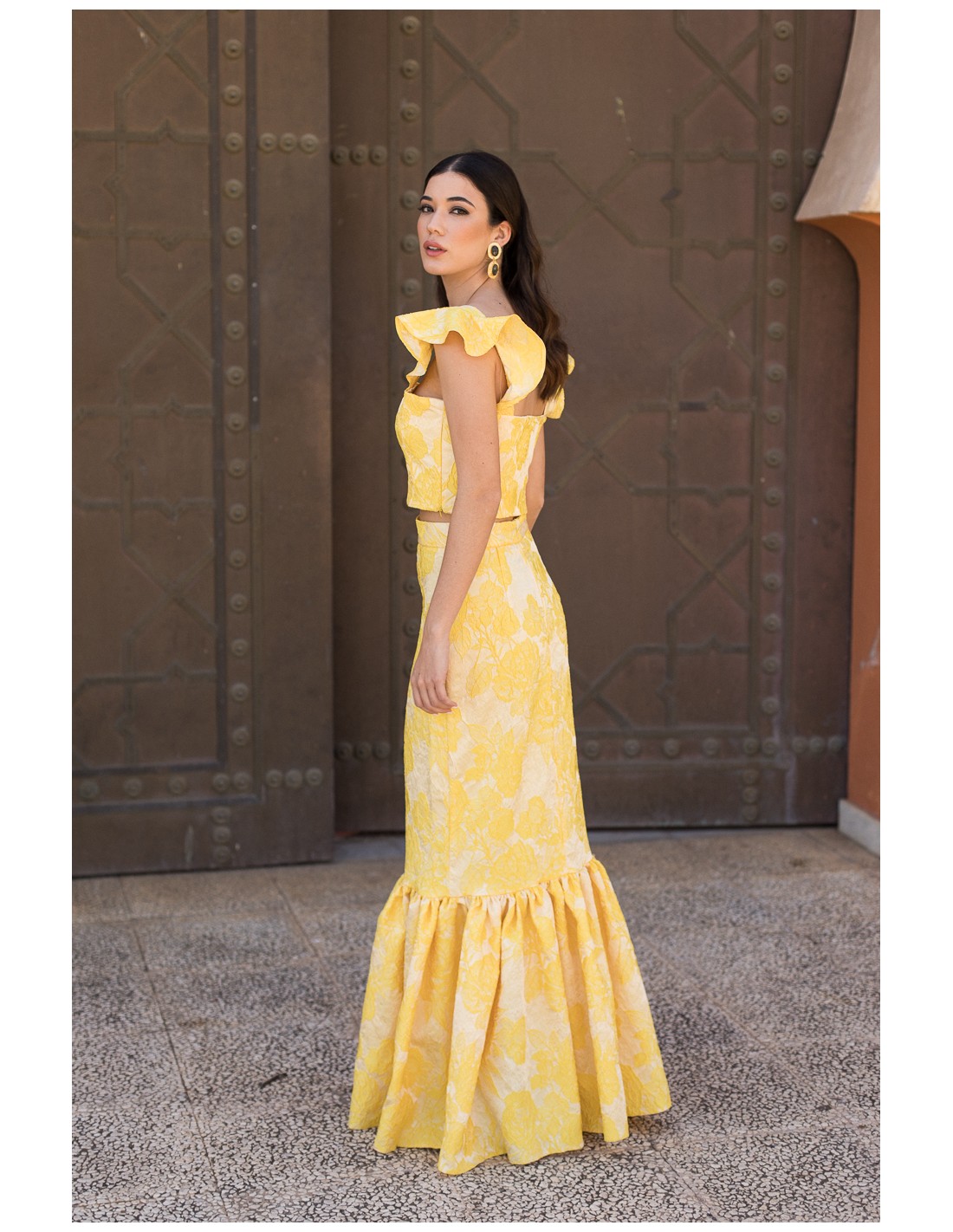 This yellow printed long skirt with ruffle bottom is a sophisticated piece that stands out for its spectacular yellow brocade fabric, ideal for special occasions. Its elegant and feminine design, along with the flowing ruffle finish, brings movement and distinction to every step.