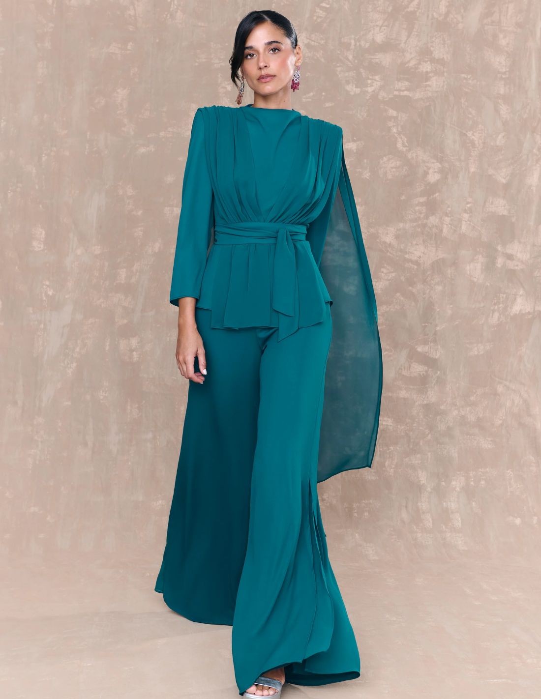 If you are one of those guests who bet on comfortable and simple suits for any event, this suit is perfect. Composed by these pants in petrol color, made in high quality georgette and with inner lining of chiffon in the same tone, with a fluid fall and elephant leg cut. With high-waist design and invisible side zipper.