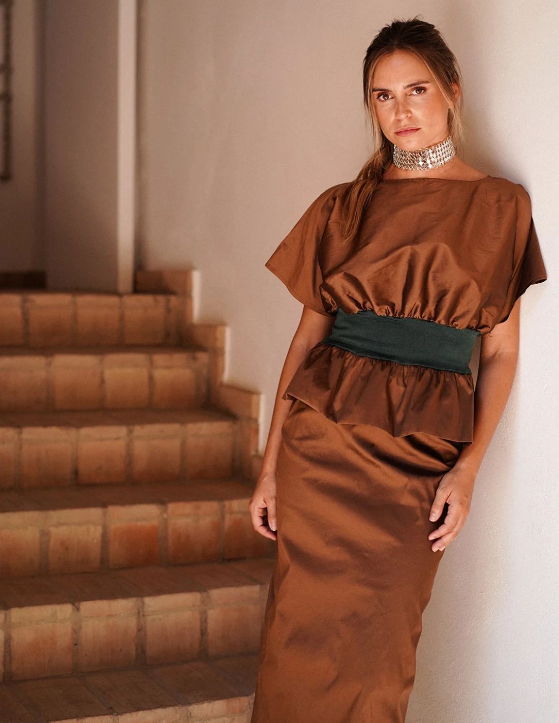 This taffeta straight midi skirt combines elegance and comfort in a single garment. Made in a soft and slightly structured taffeta in brown, it offers an impeccable drape that accentuates the waist. Its warm brown tone adds versatility and sobriety, ideal to combine with both light blouses and more formal garments.