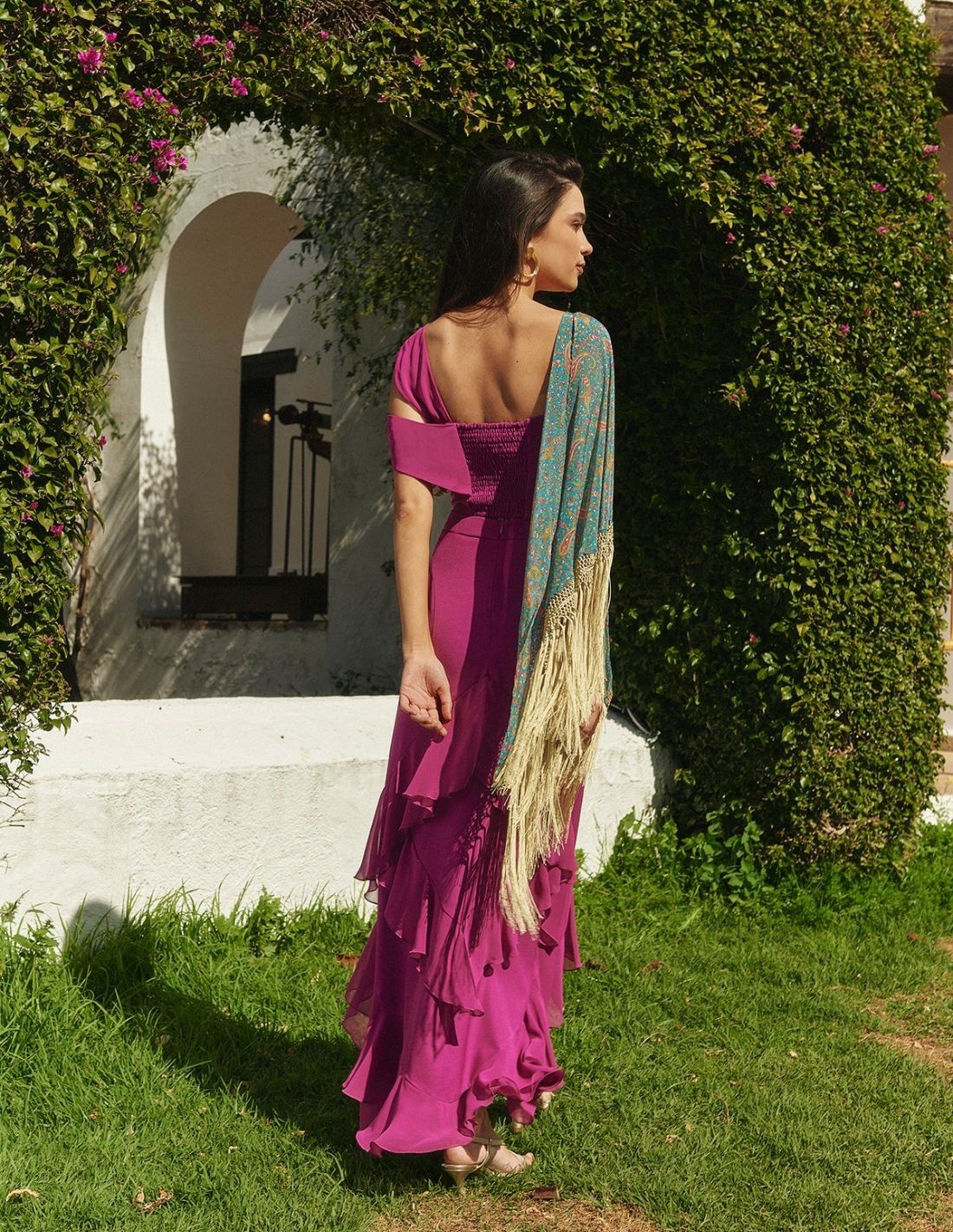 This long skirt will become your favorite. You'll want to wear it for special occasions as well as more casual wear. Made in bougainvillea colored satin fabric with asymmetrical cut. It also incorporates two openings adorned with ruffle detail made with vaporous chiffon. A very flattering garment that will allow you to make hundreds of looks, both with its matching top and with other tops for more informal occasions. Ideal for spring events.