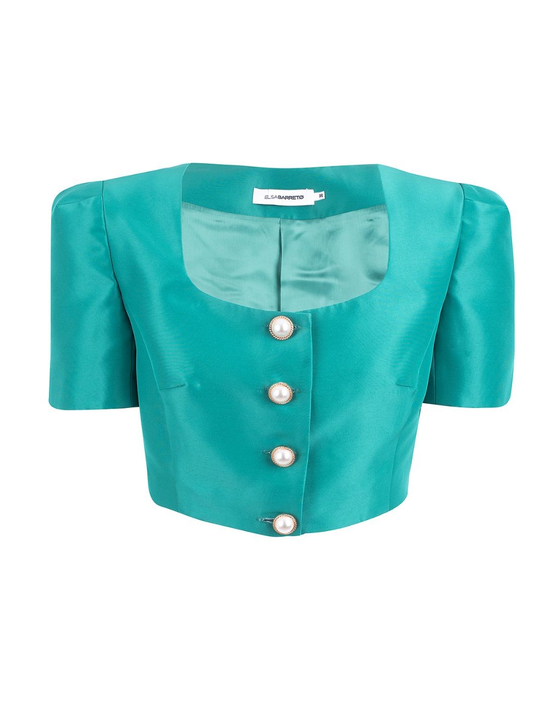 Short sleeve crop top with pearl buttons for special occasions.