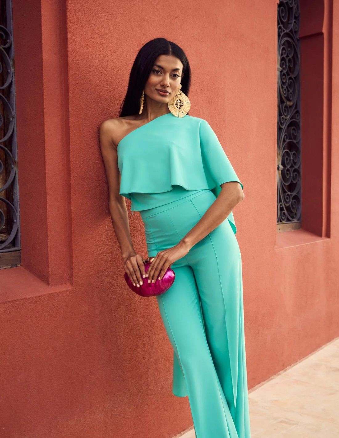 This party top is perfect to wear to any type of event especially with the matching bell bottom trousers. It features a flattering asymmetric neckline with long cape, a trend this season, which has an elegant drape and beautiful movement.