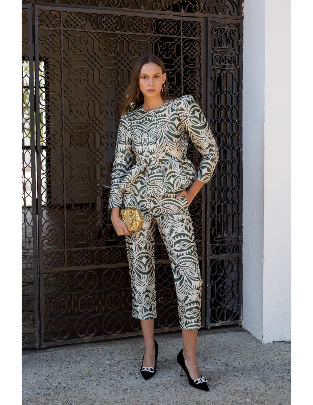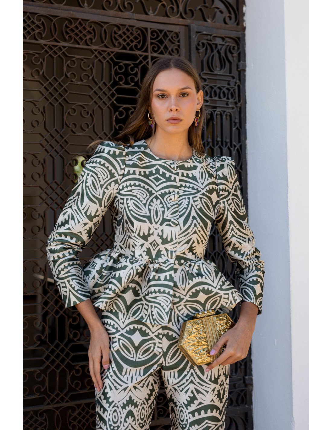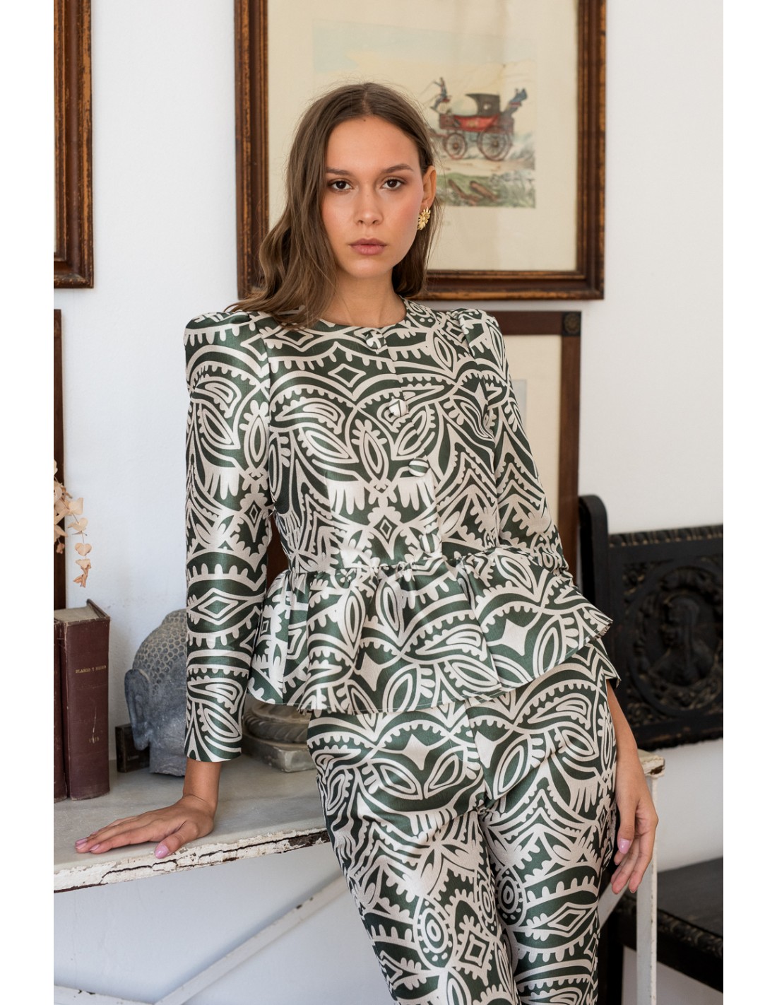 This party blouse for guests features an exclusive design in olive green and beige tones, ideal to stand out on special occasions. Made in a lightly shimmering fabric, this blouse features covered buttons on the front and puffed sleeves that enhance the feminine silhouette.