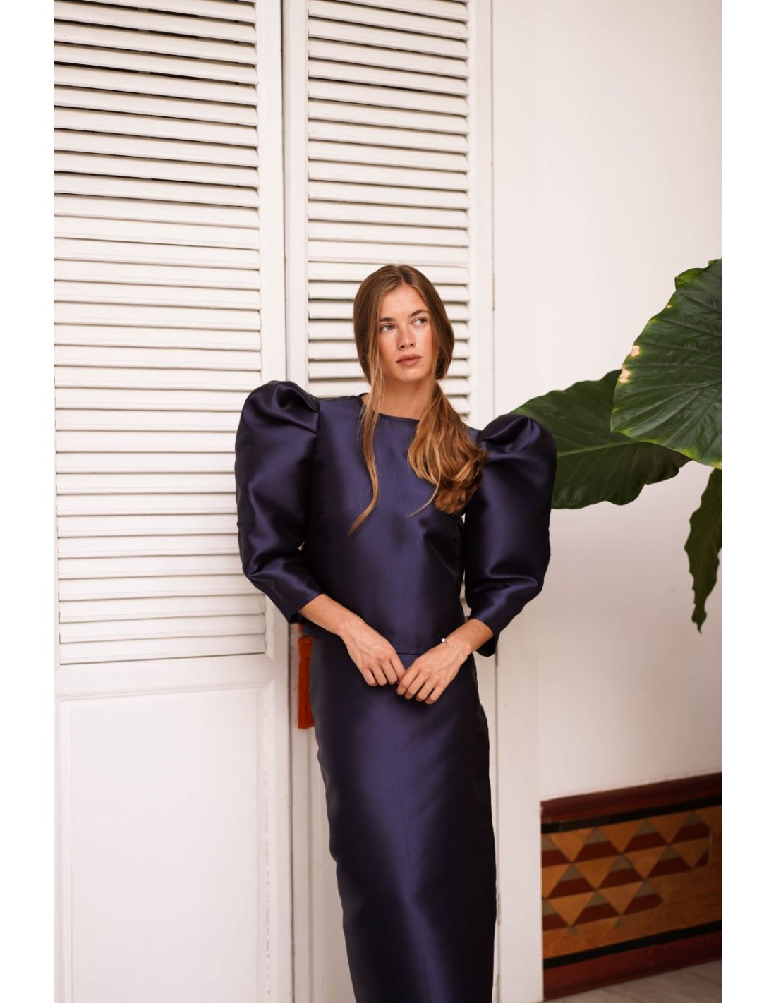 Elevate your style with this navy blue mikado top, designed to shine at your most special events. Its elegant design with elbow-length puffed sleeves adds volume and personality, while the 100% polyester mikado fabric offers impeccable structure with a subtle sheen that enhances the look.
