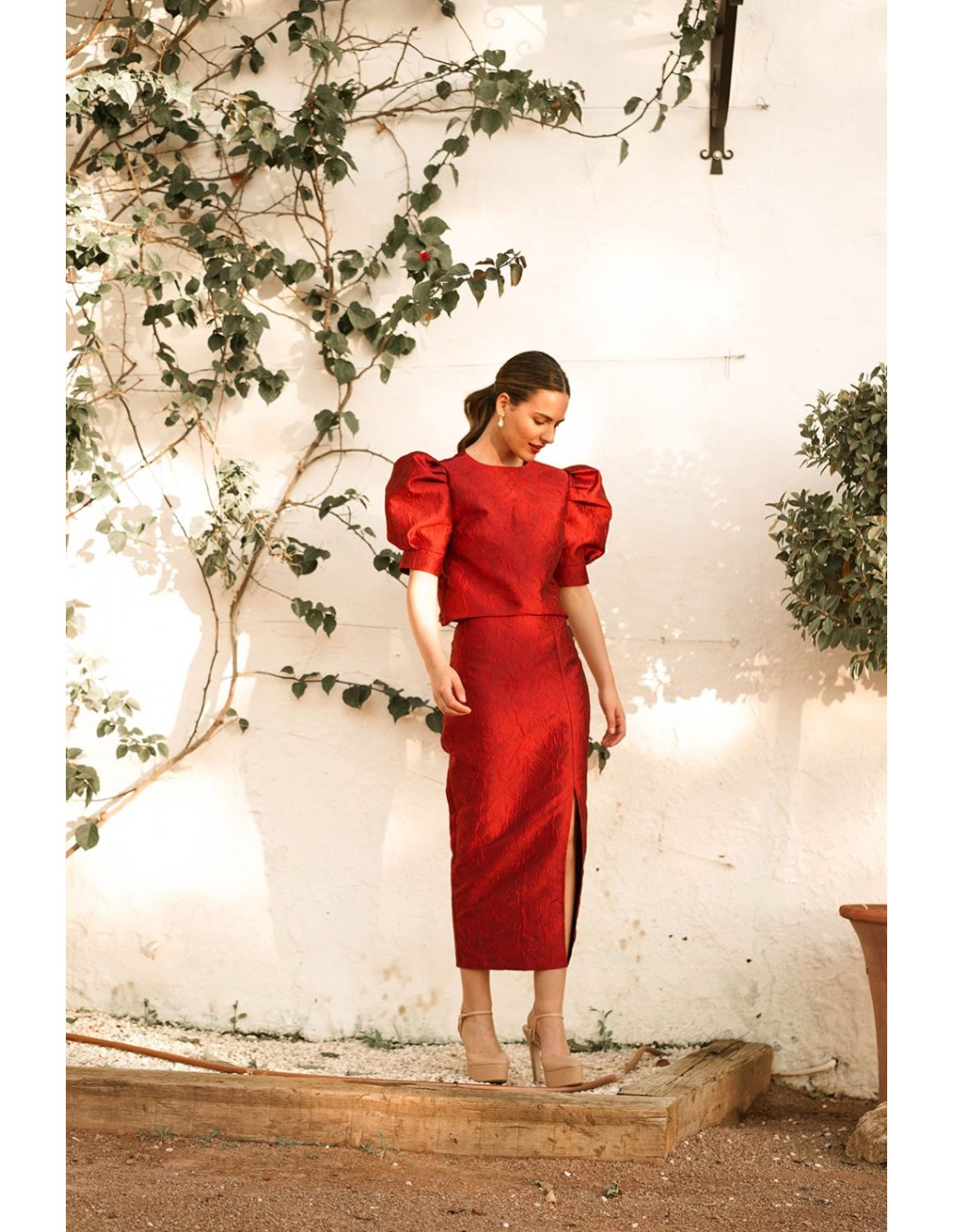 If you are your thing, this guest top is the perfect garment, along with the matching skirt, to shine in that special event. Made in floral brocade fabric with short puffed sleeves, closed neckline and burgundy color. A super elegant and special design with which you can go spectacular both graduations, weddings, communions... In addition, you can use separately the set and create many more looks.