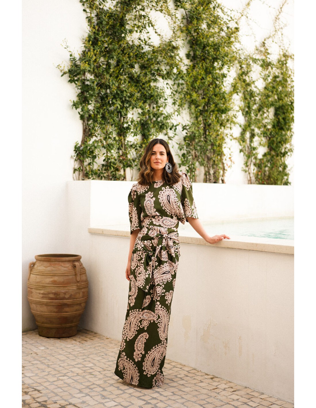 Update your closet with this elegant short sleeve printed top with shoulder pads, made of 100% polyester fabric of high quality. Its design incorporates a vibrant and sophisticated ethnic green print, perfect for adding personality to any look.