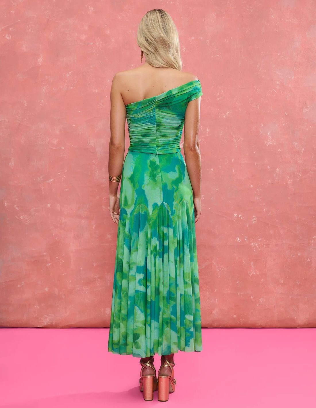 This printed guest top in green tones is the perfect look if you are one of those guests who bet on a comfortable and elegant outfit. Its asymmetrical neckline provides a sophisticated and modern look, while the draping stylizes the silhouette and enhances the figure. Made in a lightweight fabric that adapts to the body, creating a flattering effect thanks to its front gathering. The watercolor print in green tones brings freshness and personality, making it an ideal top for daytime events or summer celebrations. Perfect to combine with the midi skirt that completes the set.