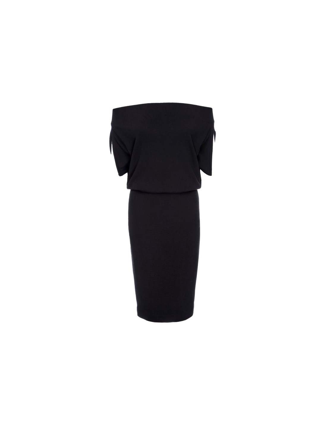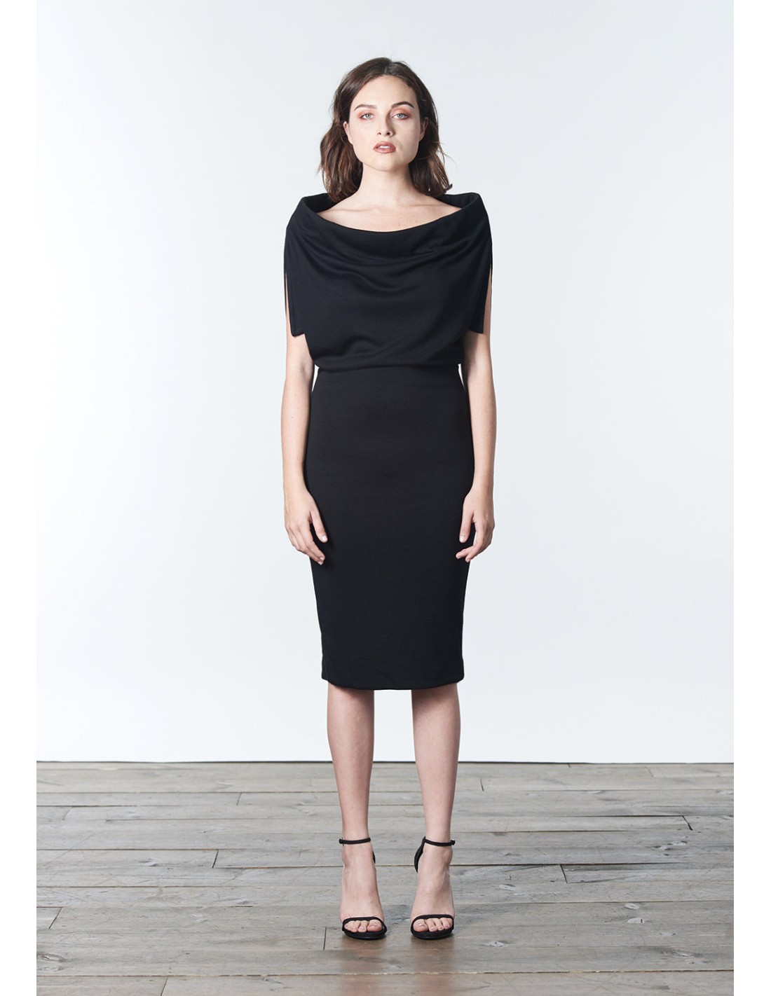 This midi dress is crafted in a thick, sustainable Tencel knit, designed to be worn three ways: open shoulder, asymmetrical with one shoulder or elevated, evoking classic Audrey Hepburn style. This dress combines a tight fit at the hips with a blouson design at the bodice, enhancing the natural curves of the shoulders.