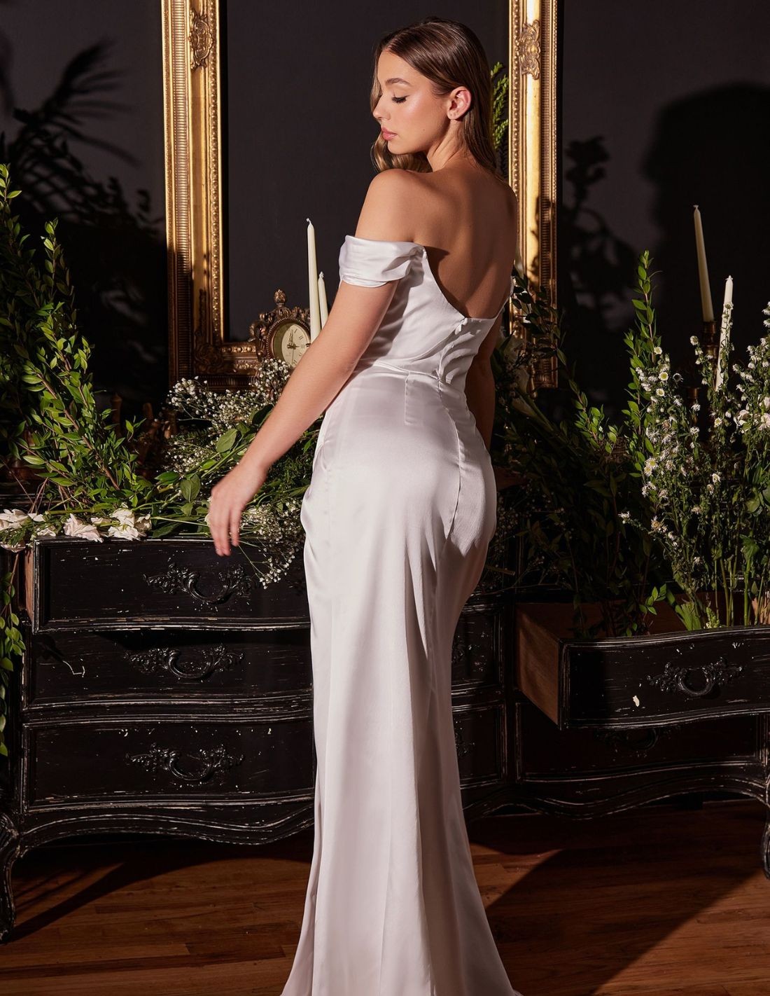 Long satin wedding dress with bare shoulders.