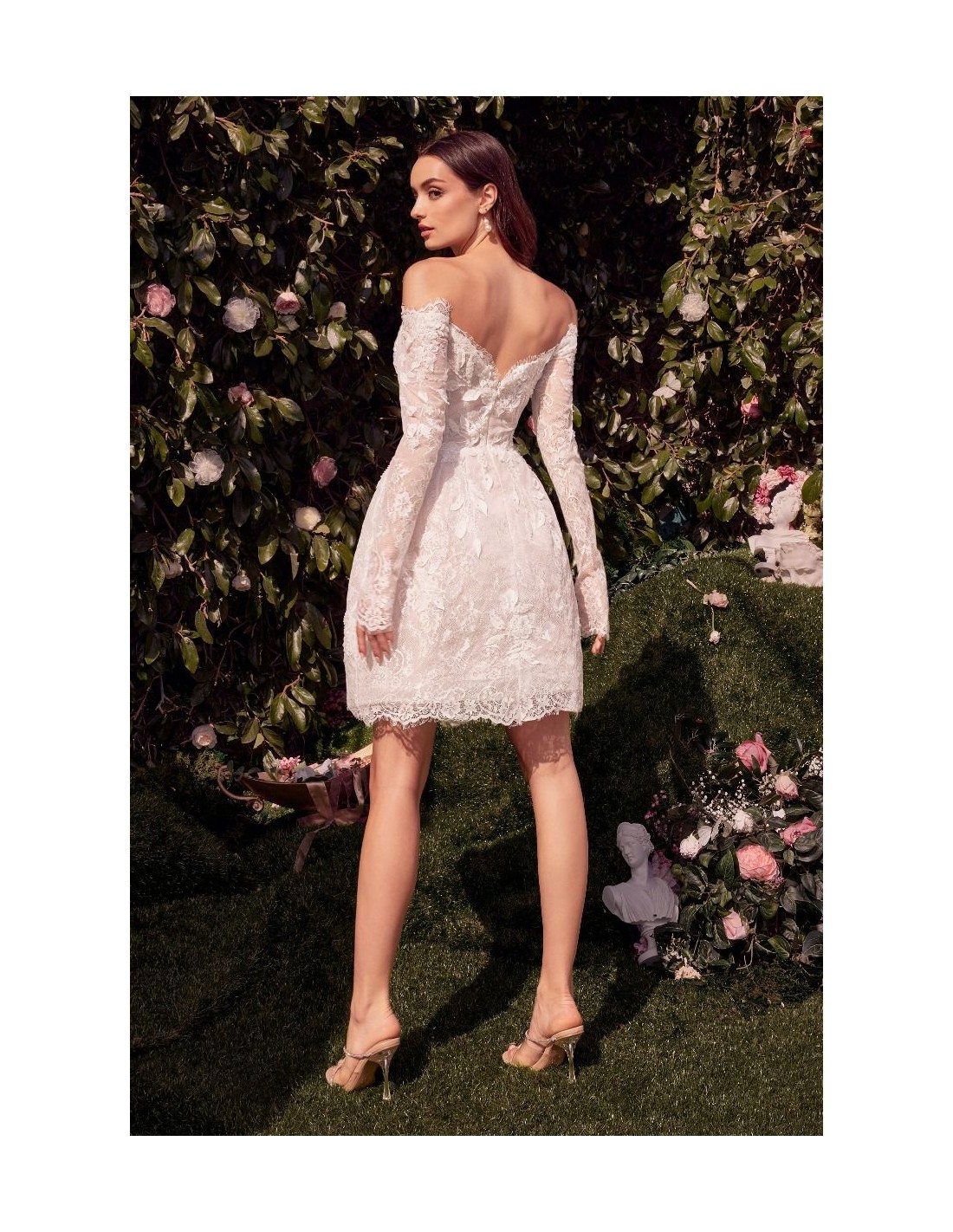 This soft A-line dress features a sweetheart off-the-shoulder neckline and long sleeves adorned with delicate Chantilly lace and a scalloped eyelash lace hem. The A-line silhouette offers a graceful and flattering fit, making it perfect for a wedding reception, engagement photoshoot, or rehearsal dinner. Embrace timeless elegance with this beautifully detailed dress, designed to make every special occasion unforgettable.