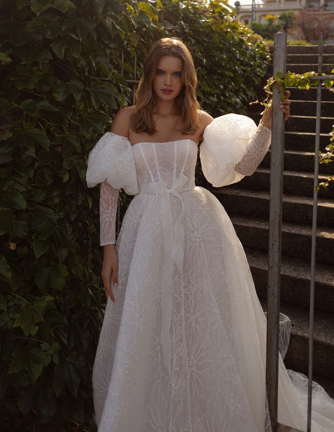 Crafted in exquisite lace, this design is fully lined to ensure maximum comfort without transparency. It also features detachable puffed sleeves, allowing you to transform the look according to the moment of the celebration. The slitless skirt flows gracefully, offering a neat and sophisticated finish, ideal for brides looking for a classic style with a modern twist.