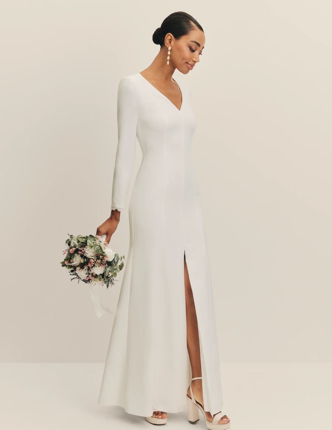 A great day like your wedding deserves a design to match. This long white wedding dress is made of bi-elastic fabric with V-neckline and long sleeves. It also incorporates very flattering structured shoulder pads. Undoubtedly, a simple, sophisticated and timeless design with which it is impossible to fail. The skirt incorporates a front opening that provides movement and sensuality when walking. The sleeve stands out with a lace detail at the end, beautiful! Perfect for both civil and religious ceremonies.