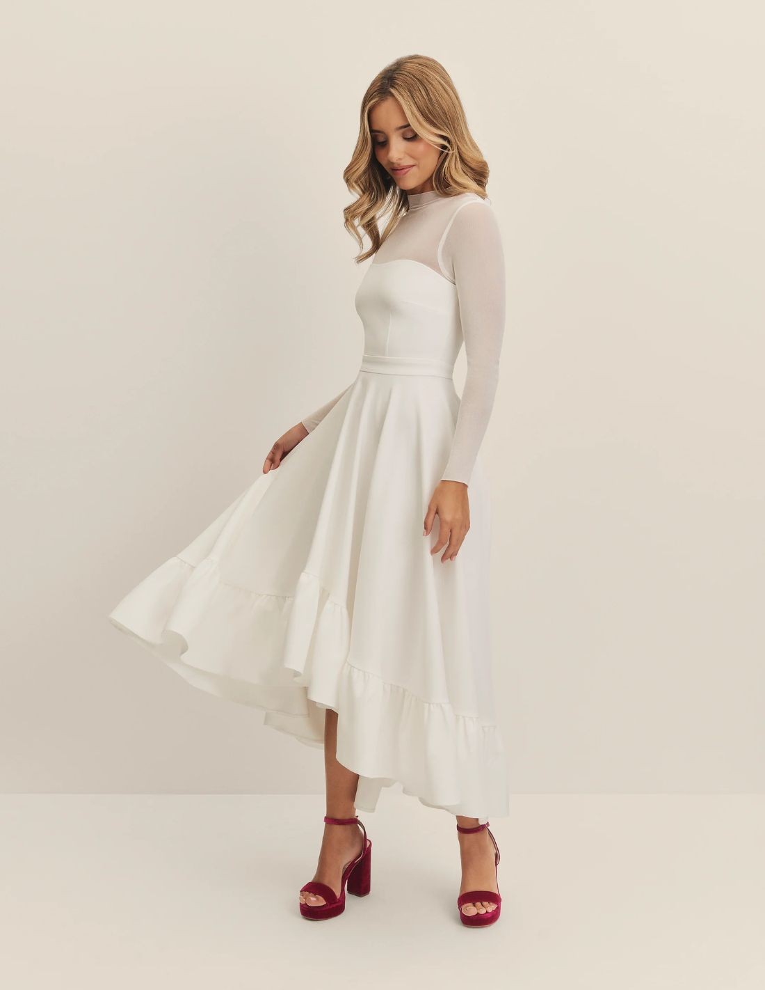 Midi wedding dress with sweetheart neckline and asymmetrical skirt