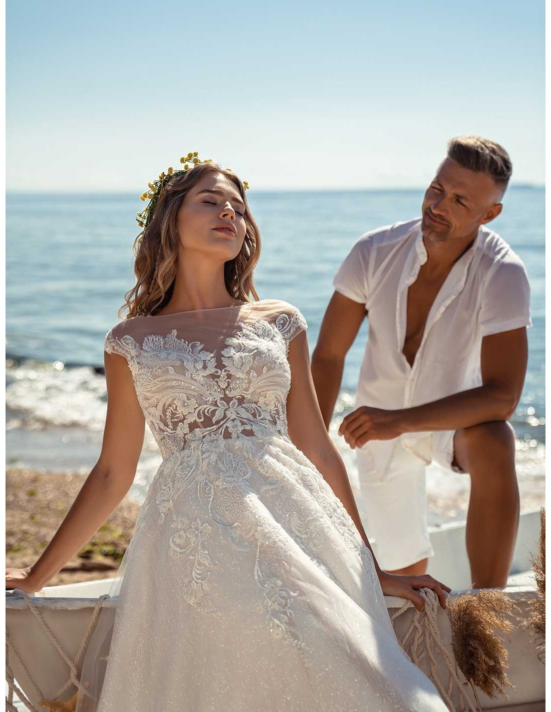 This sensual princess cut wedding dress with delicate floral appliqués embroidered with precious Swarovski crystals cascades delicately over the waist to merge into a voluminous tulle skirt with soft sparkles.