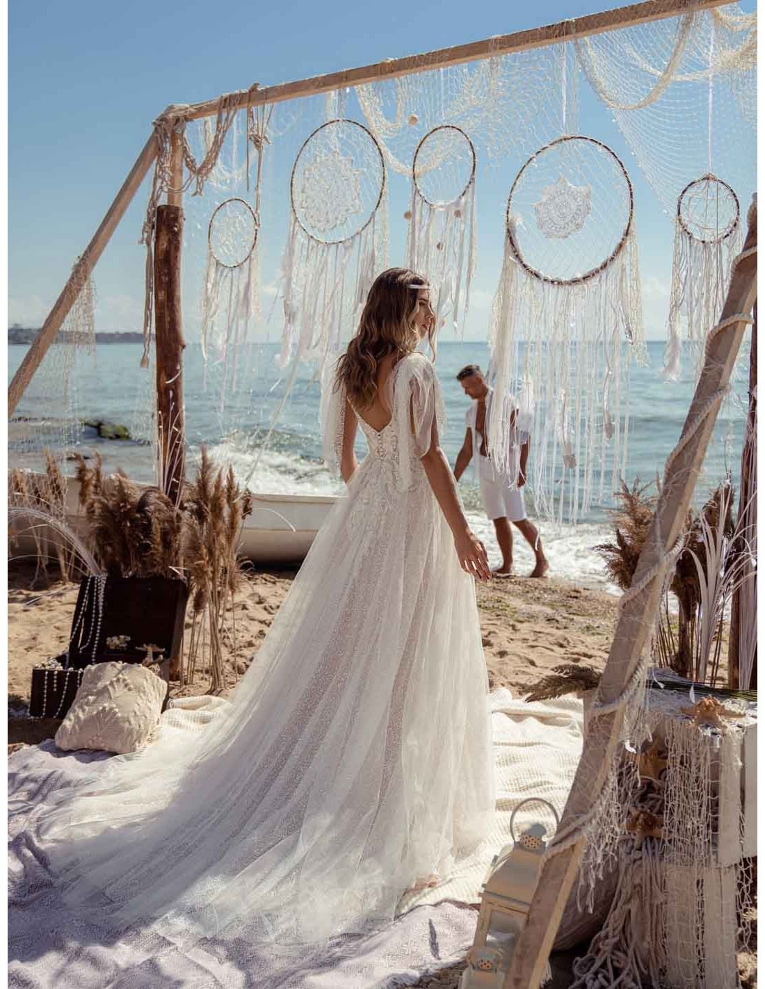 This wedding dress made of delicate tulle with harmonious lines to draw a wonderful floral decoration that wraps the body and originates the beautiful tail from a lush neckline in the back.