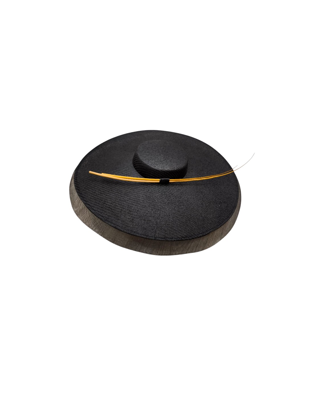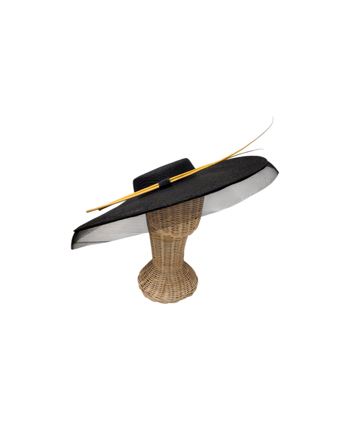 For your fall events, nothing like an elegant black pamela to add that touch to your look. Handcrafted with horsehair detail around, and decorative rachis in orange tones. Undoubtedly, the accessory that will make the difference and that will elevate your look to its highest level. Perfect for daytime events that thanks to its color, you can combine with a variety of garments.