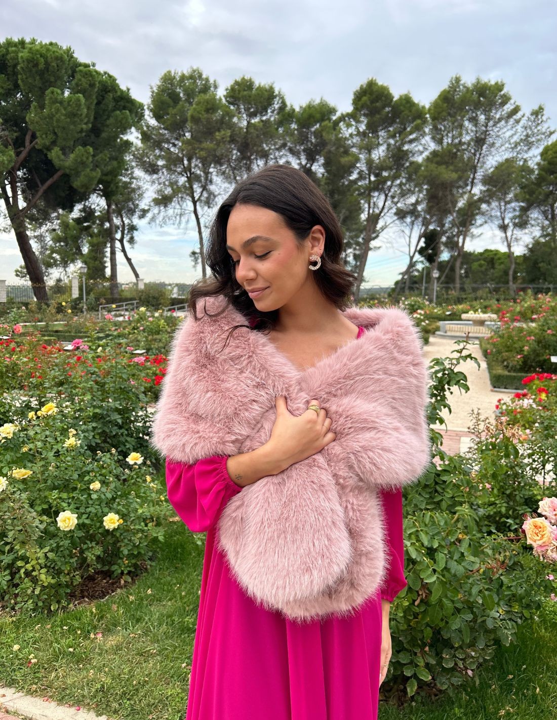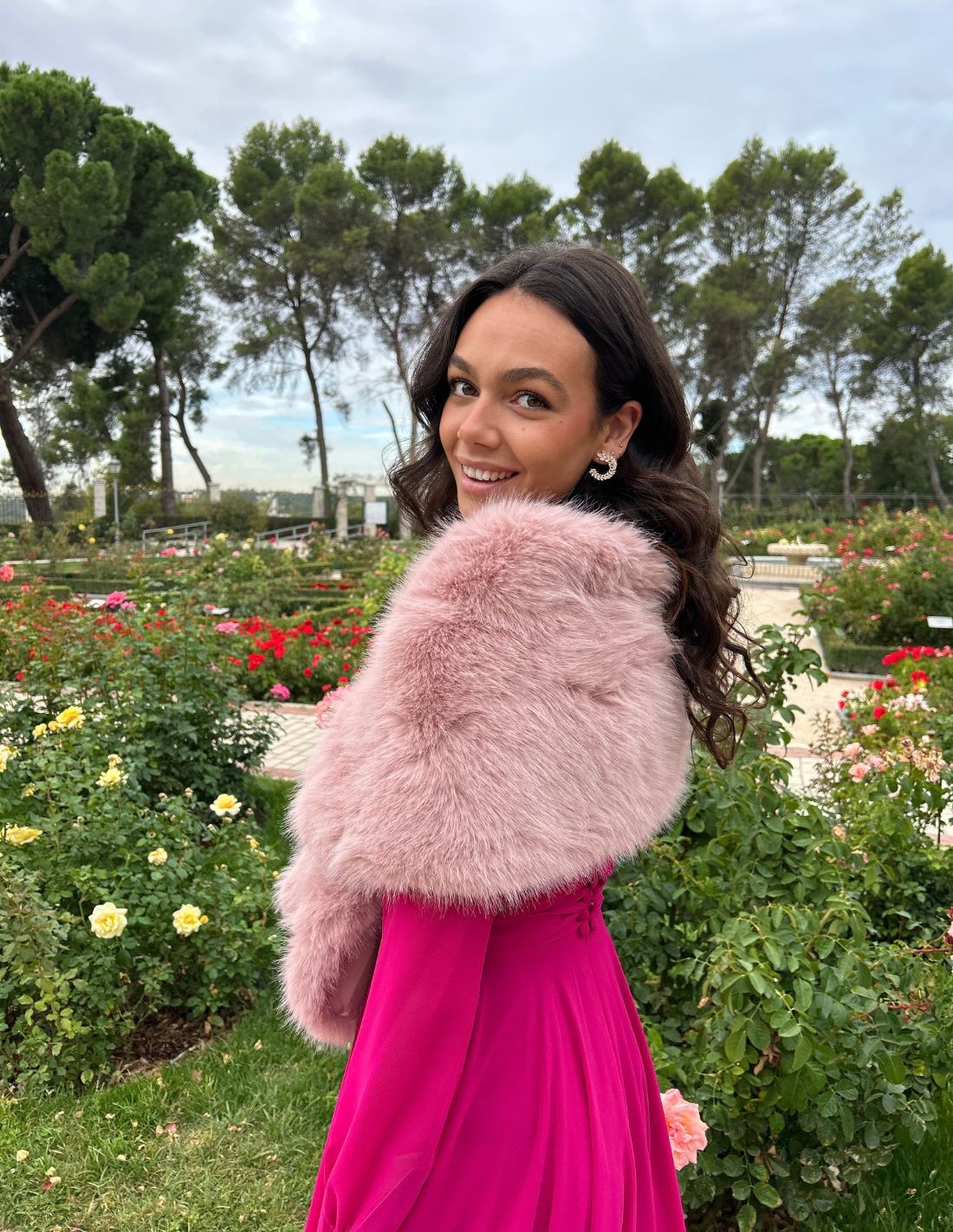 why choose a short vegan hair wrap for your wedding guest look? The short vegan fur stole is one of the most versatile and elegant accessories for wedding guests and evening events. Soft, warm and lightweight, it adds a touch of sophistication without resorting to animal fur, making it a sustainable and conscious choice. It is perfect for autumn and winter ceremonies, as it protects from the cold without losing style. In addition, its short design allows you to wear the dress in full silhouette, enhancing the look with a glamorous and timeless air. You can wear it over the shoulders for a classic style or closed in front with a brooch for a more sophisticated finish.