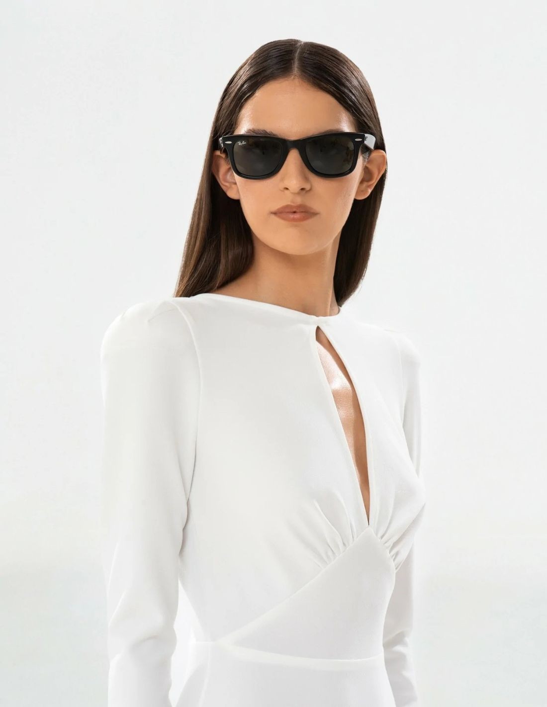 Vestido midi blanco de línea impecable con falda tipo A que estiliza la figura. Presenta escote a la caja con elegante abertura en forma de lágrima, manga larga con delicado fruncido en el hombro y cierre con corchete en el cuello.
