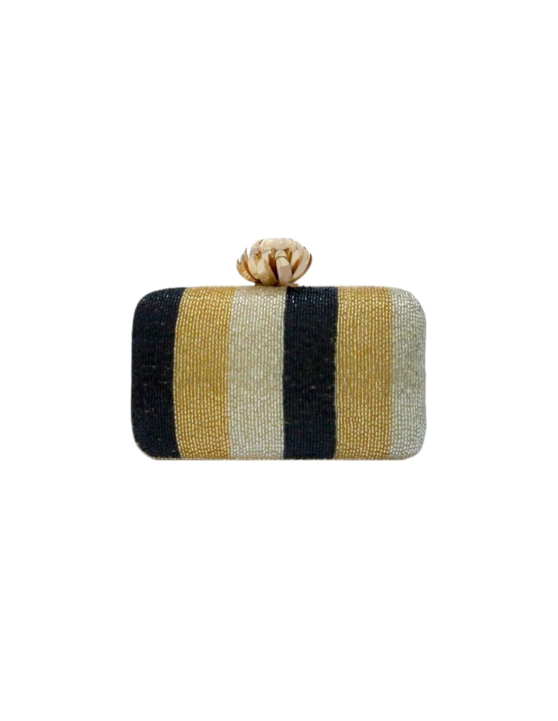 Este elegante bolso de mano bordado metalizado es el complemento perfecto para elevar cualquier look de invitada o noche. Su sofisticado diseño combina tonalidades negro, dorado y champagne, aportando un brillo sutil y refinado. Cuenta con un cierre joya en forma de flor de loto bronce, que le añade un toque distintivo y glamuroso.
