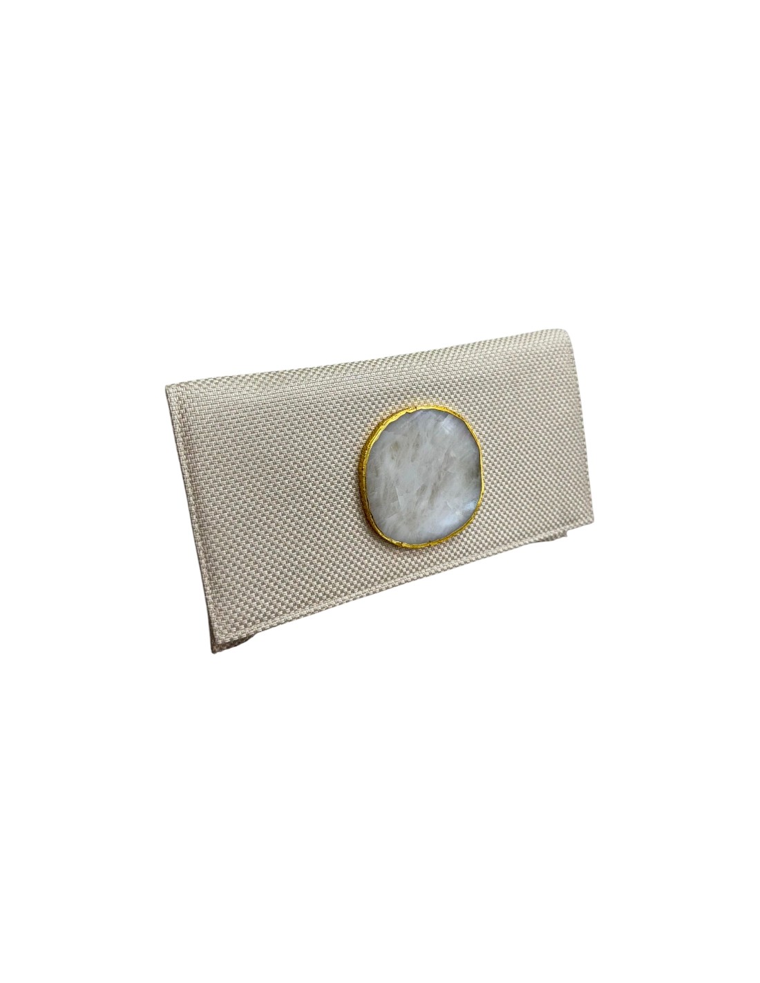 La cartera de yute crudo destaca por su estilo natural, elegante y atemporal. Confeccionada en yute de alta calidad, su diseño incorpora un detalle de piedra decorativa en la misma gama cromática, que aporta un toque sofisticado sin perder su esencia orgánica.