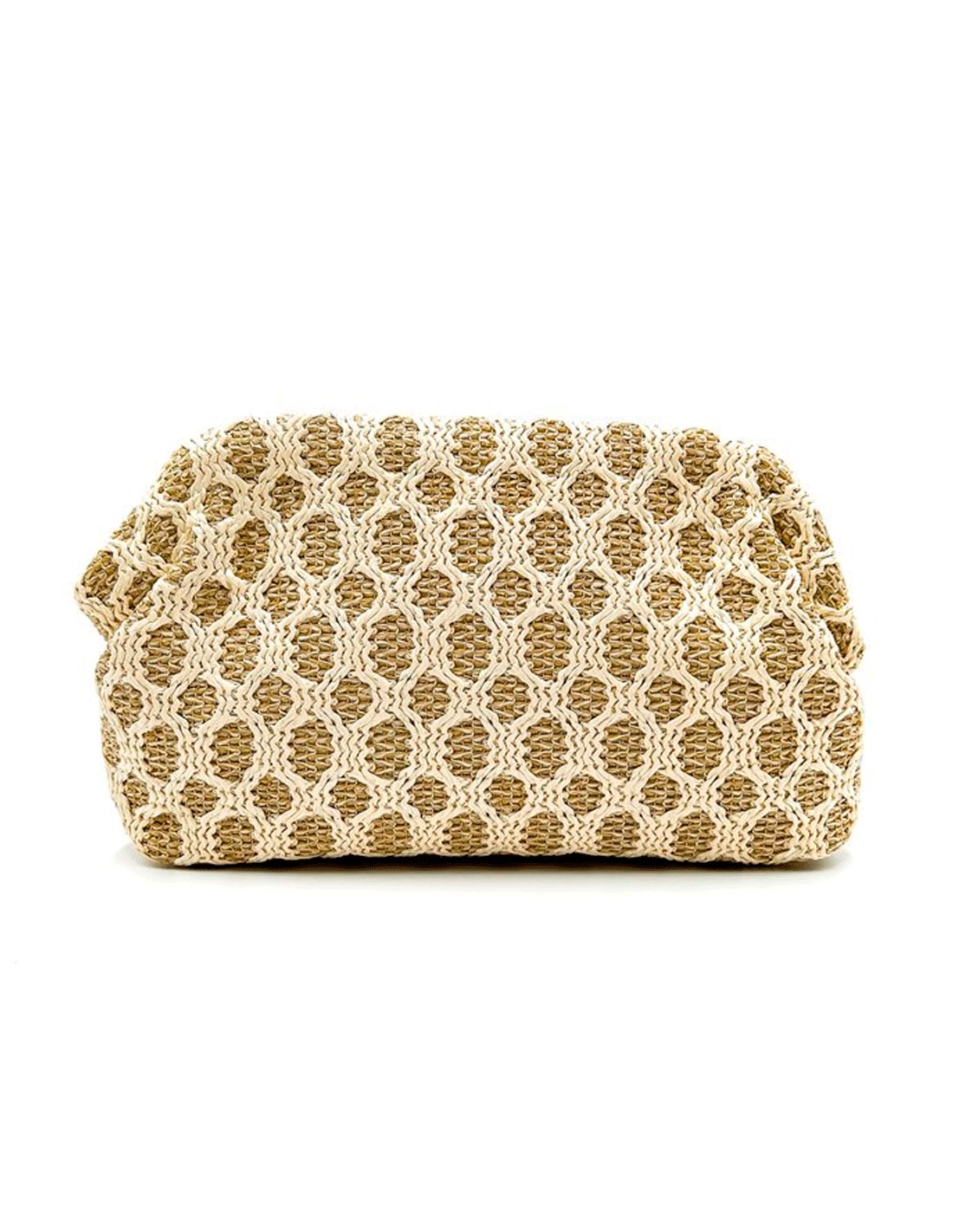 Cartera de fiesta tipo clutch en efecto rafia con dibujo calado en tonos beige y camel. Elegante, ligera y perfecta para bodas de día.