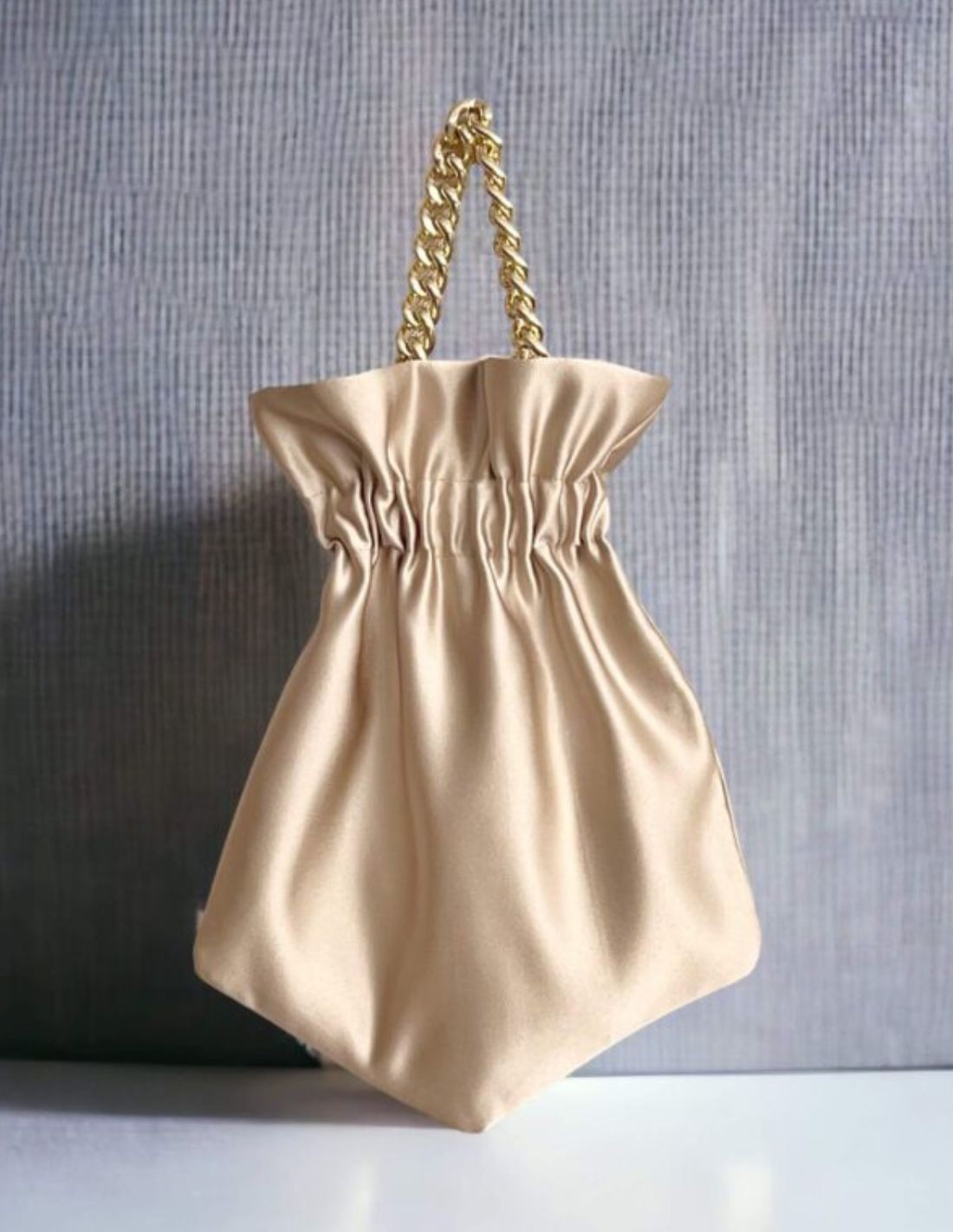 Esta bombonera para eventos hecha a mano en una variedad de tejidos, como raso, crepé y mikado, es el complemento perfecto para tus looks de evento o para añadir un toque chic a tus outfits más casuales. Con una cadena gruesa para llevarla en la mano y una cadena interior para colgarla, combina estilo y versatilidad.