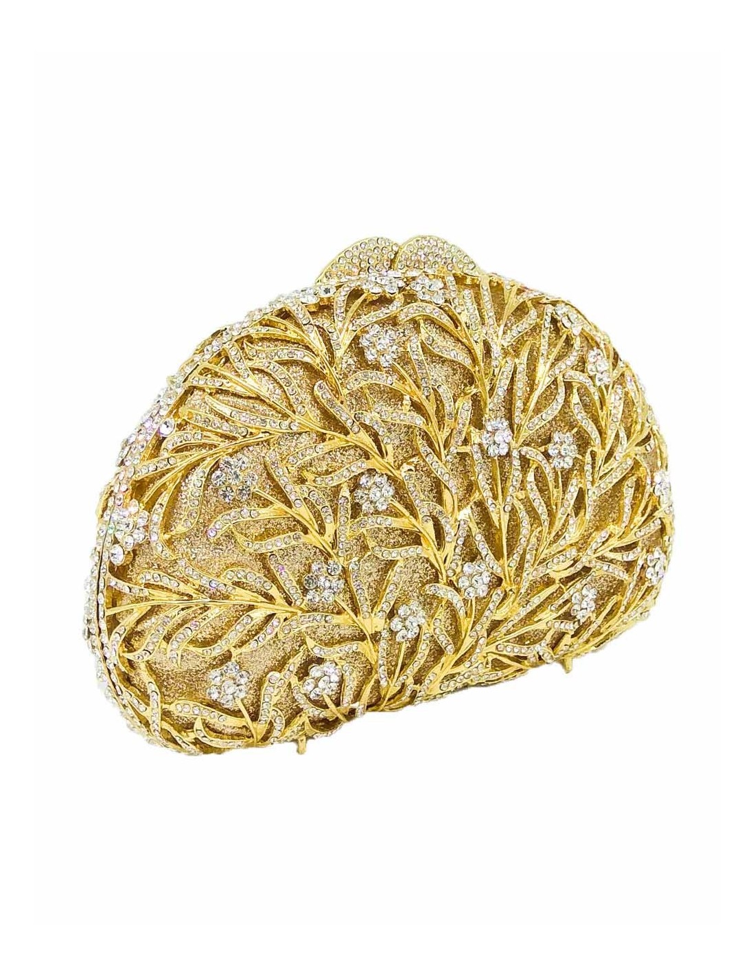 Bolso de fiesta realizado a mano de metal con decoración realizada con pequeñas flores y cristales de Swarovski.