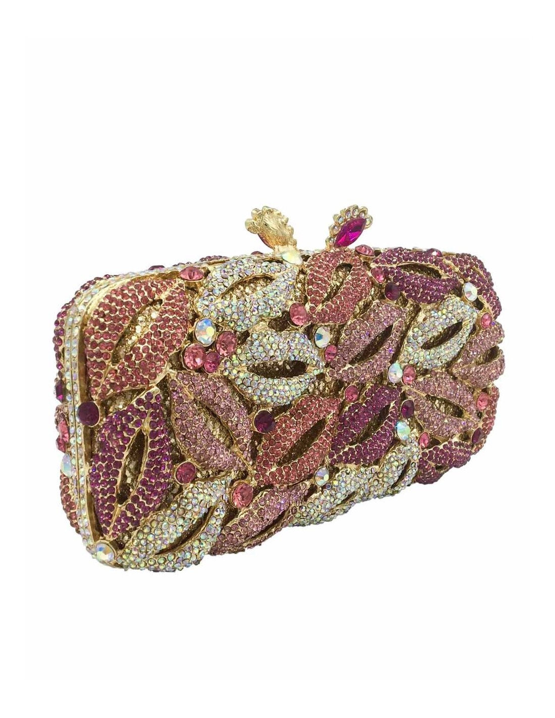 Bolso de mano joya realizado en metal con pequeños cristales formando besitos en diferentes tonos de rosa y blanco.
