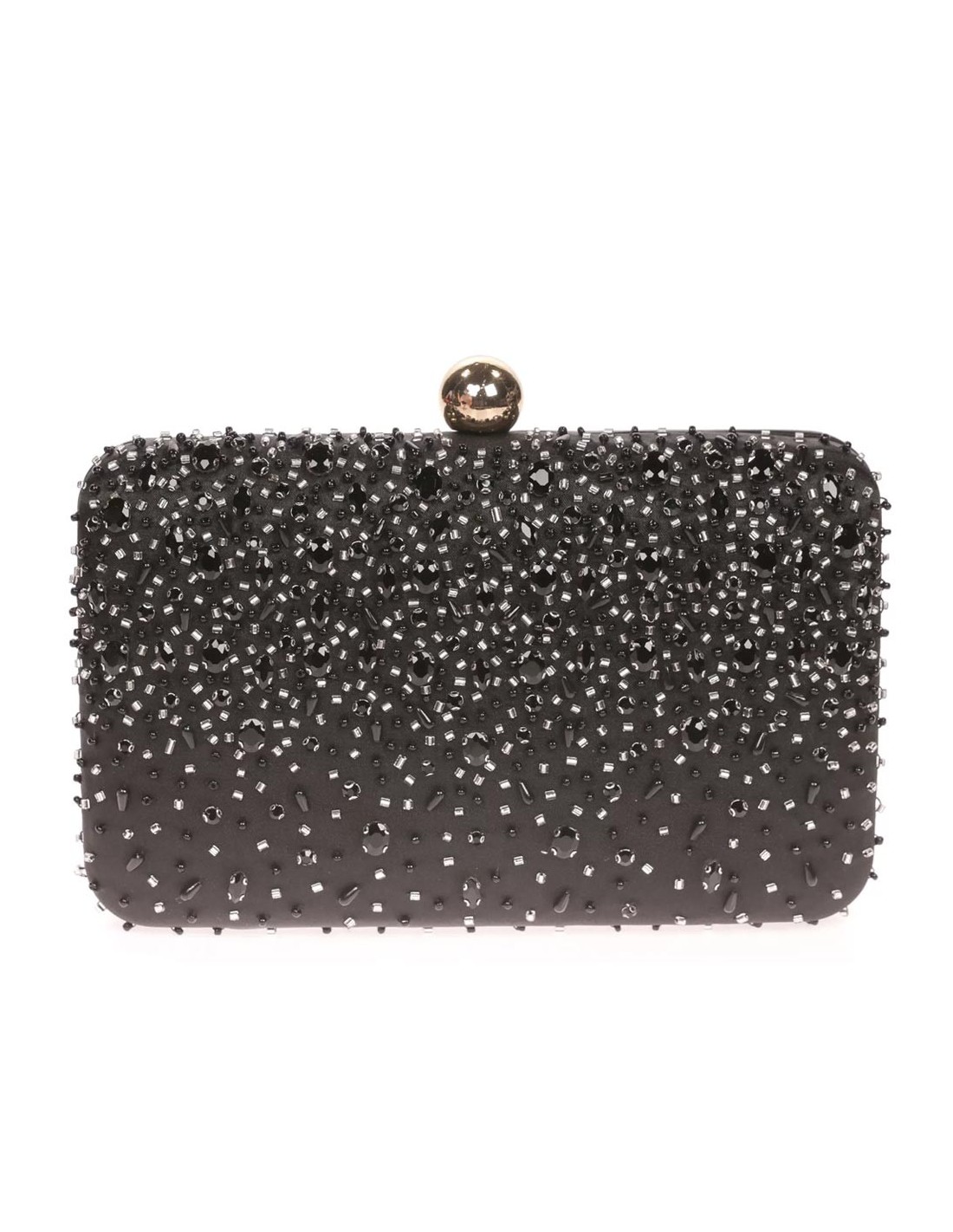 El bolso de fiesta con pedrería cosida en raso está forrado por dentro y tiene un delicado cierre metálico metalizado en forma esférica.