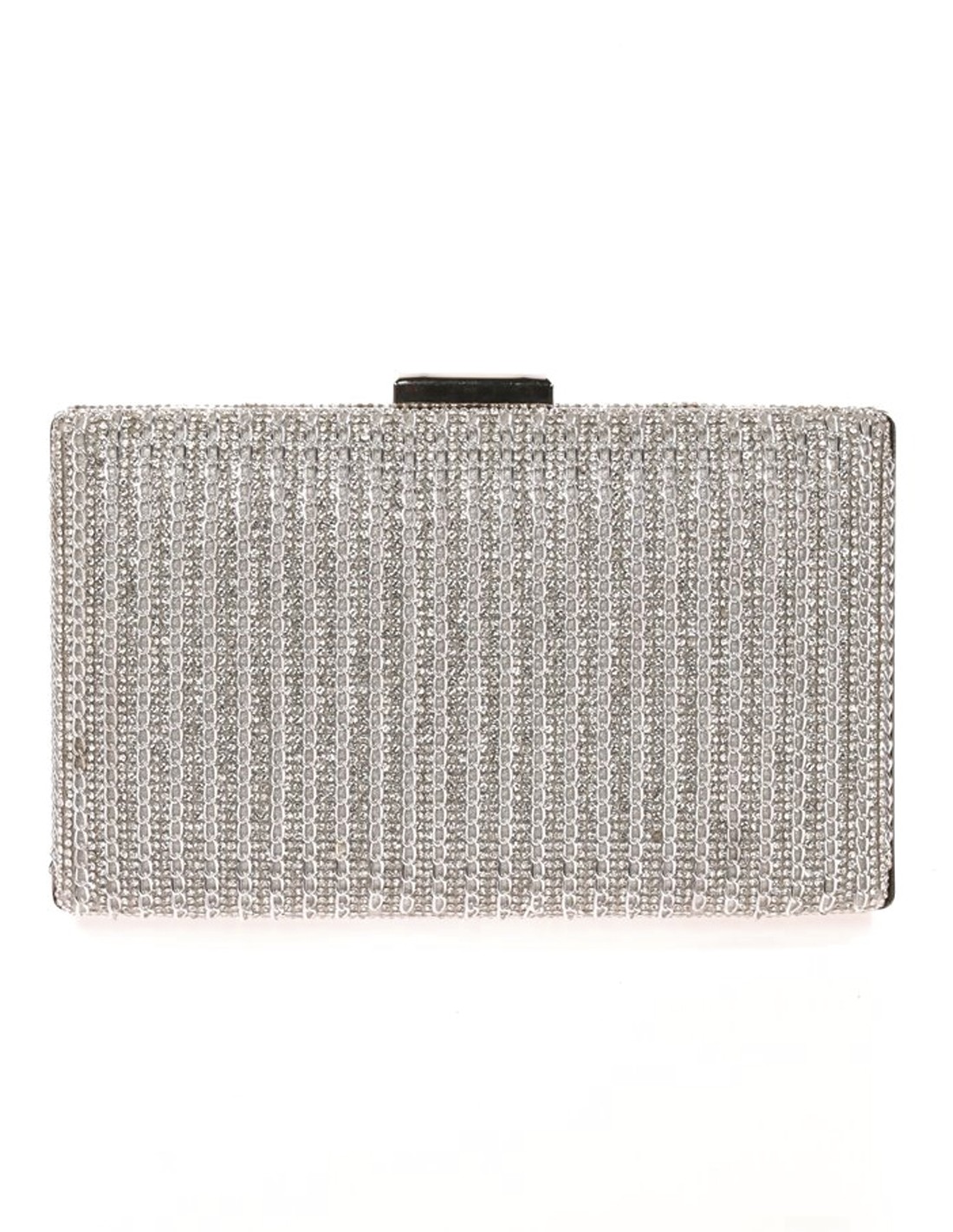 Bolso de fiesta de pedrería disponible en oro y plata.