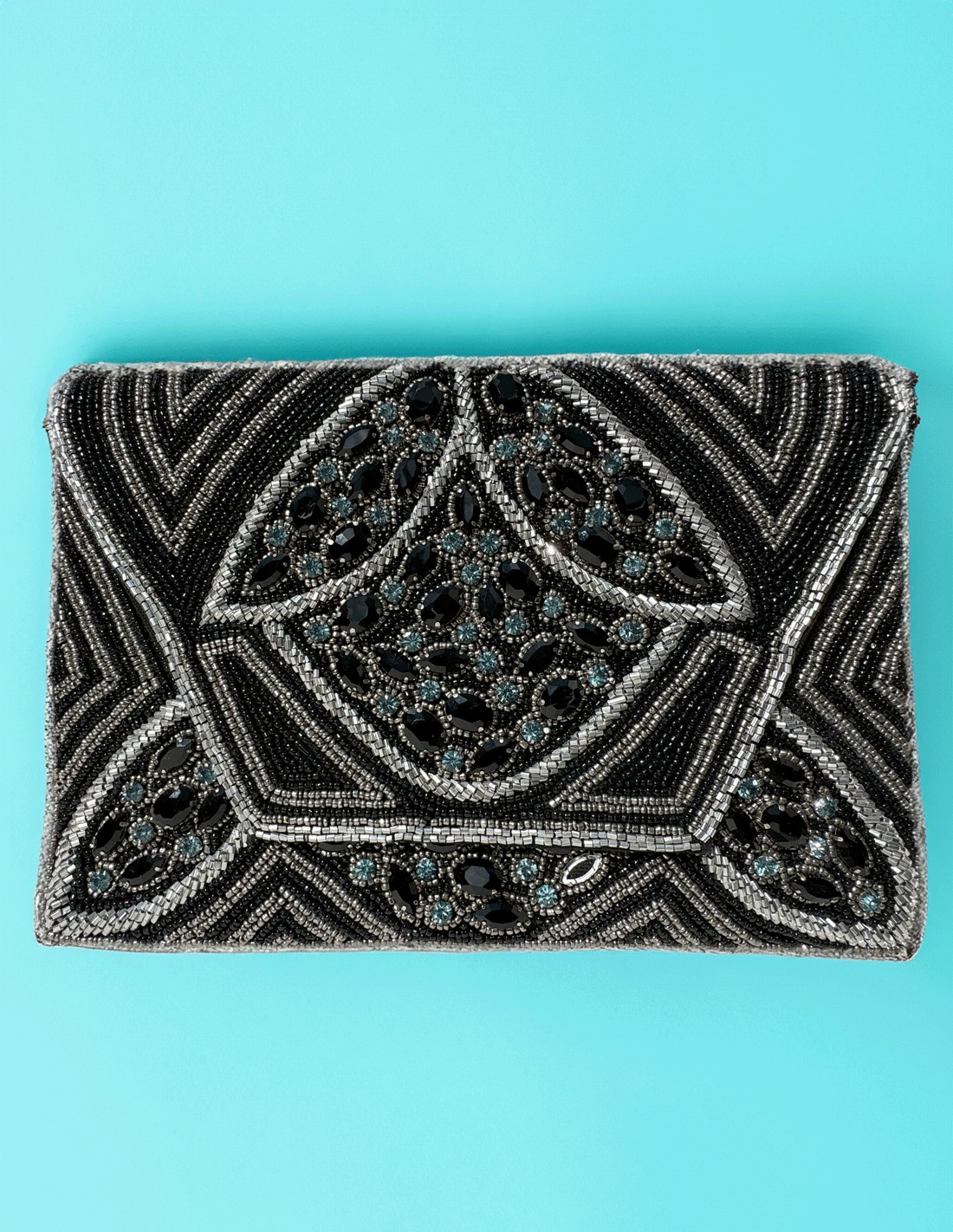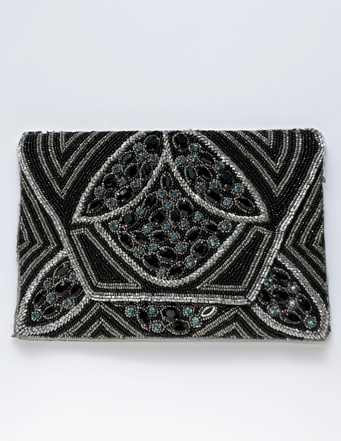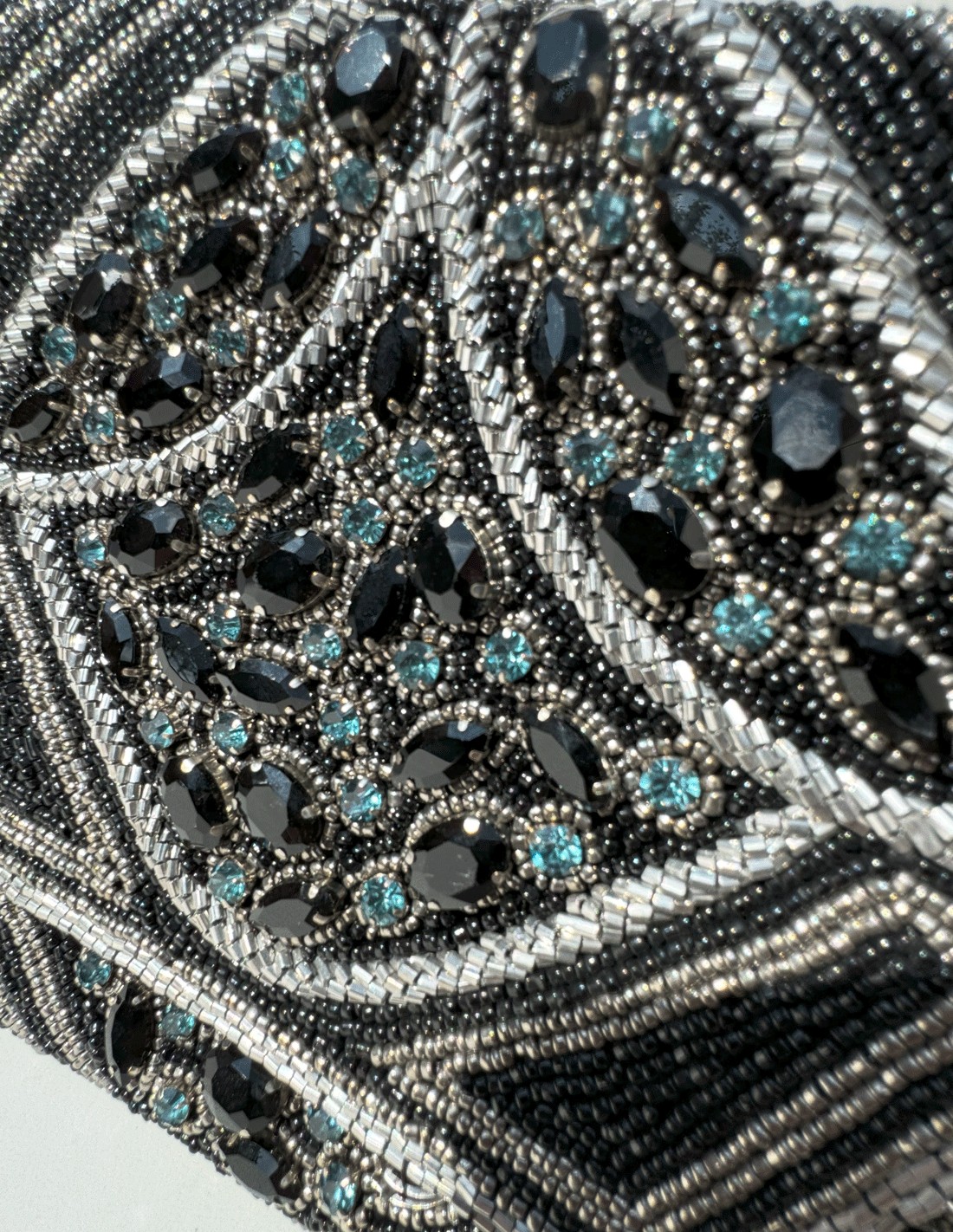 Esta Cartera de mano de pedrería en tono negro con cristales artesanal está hecha a mano en la India es una obra de arte única y sofisticada. La combinación de cuentas y cristales negros y plateados con piedras turquesas crea un diseño elegante y versátil que te hará destacar en cualquier ocasión especial.