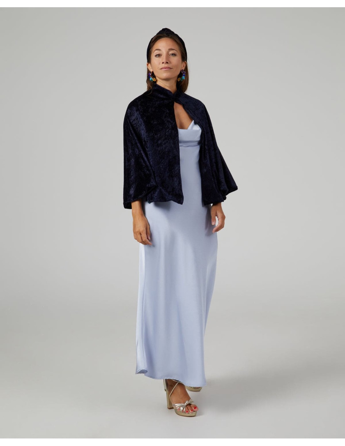 Capa corta de terciopelo azul marino con cierre al cuello para invitadas, madrinas y ocasiones especiales.