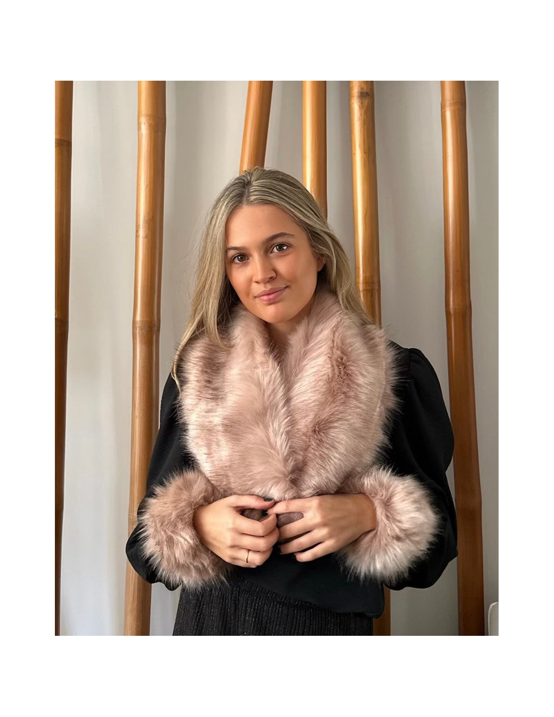 Esta estola de pelo para invitadas de invierno se realiza en pelo sintético color nude, diseñada para proporcionar elegancia y confort en los días fríos.