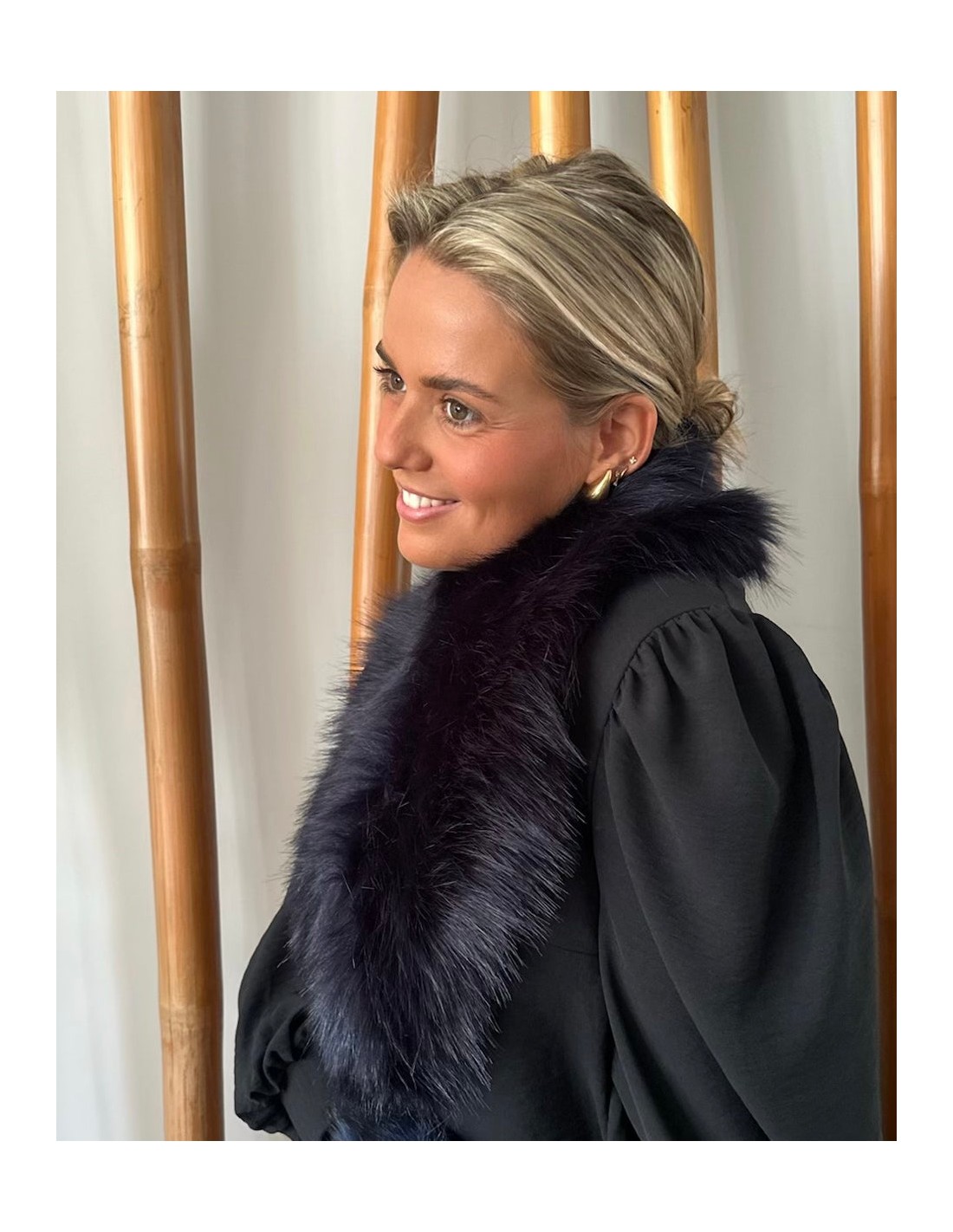Esta estola-cuello de pelo para invitadas a ocasiones especiales se realiza en un elegante pelo color azul noche perfecto para añadir un toque elegante a tu outfit diario o de invitada. Un complemento imprescindible que te aportará estilo y calidez en cualquier ocasión.
