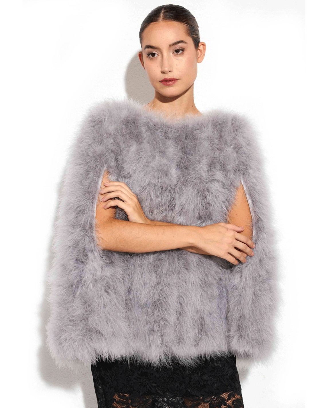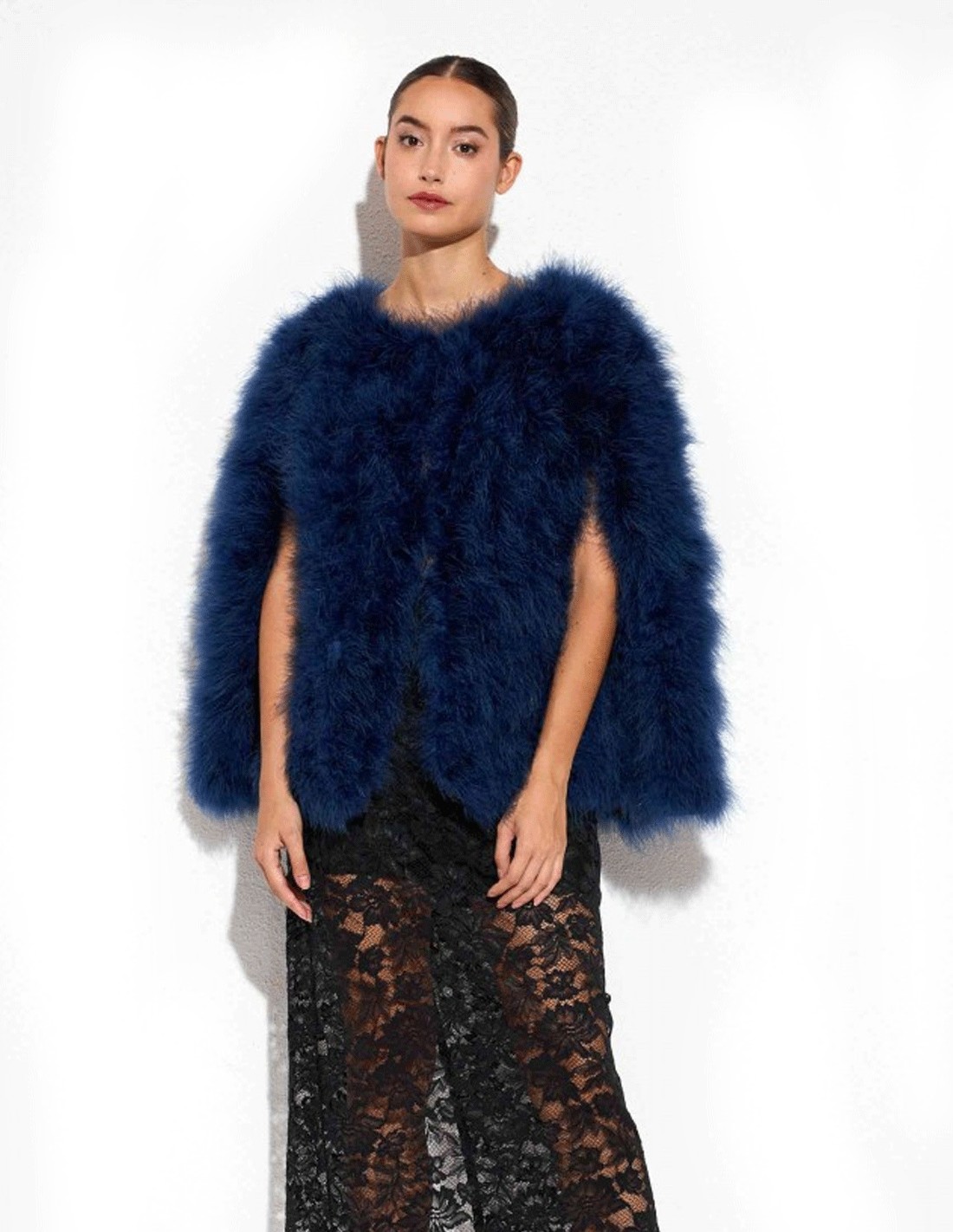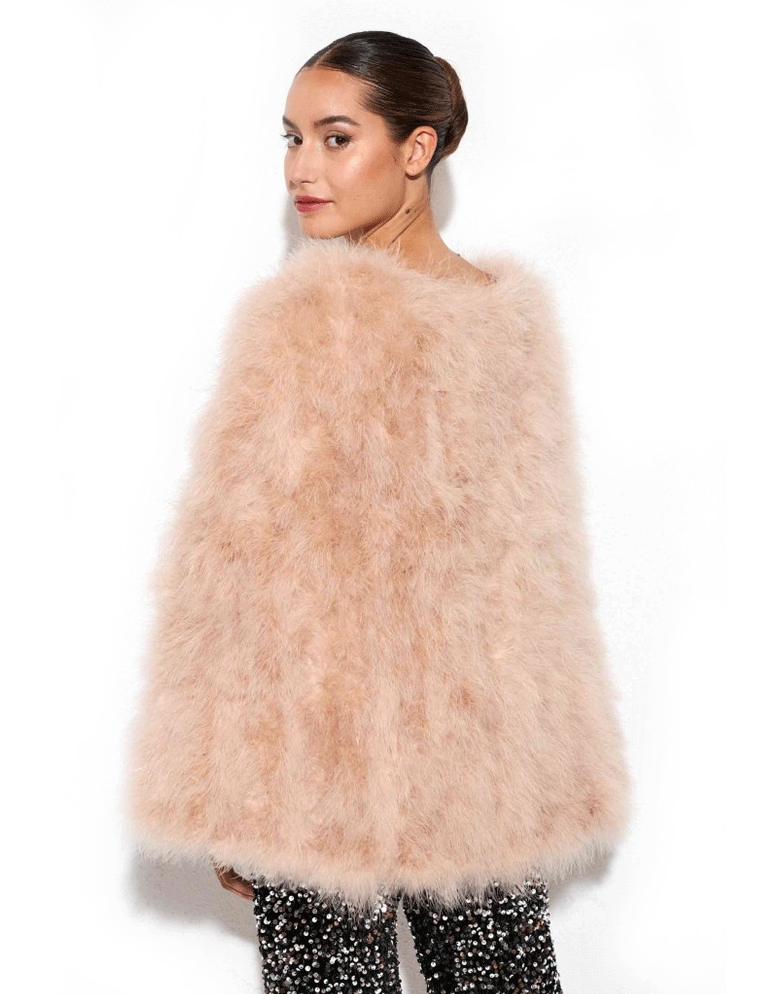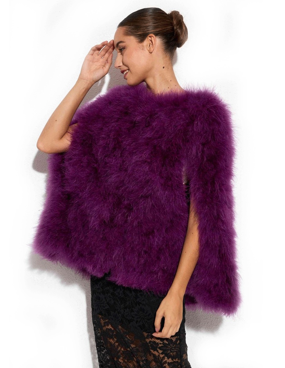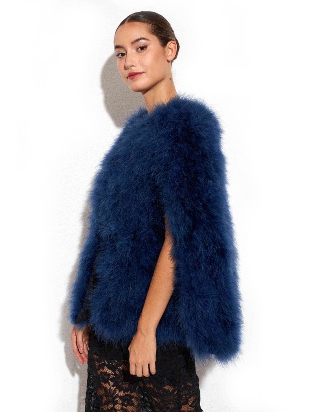 Descubre la elegancia atemporal de nuestra Capa de plumas de avestruz para invitada.
